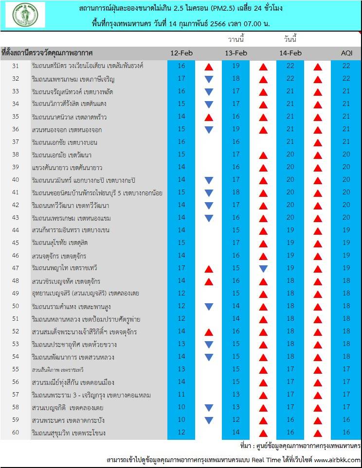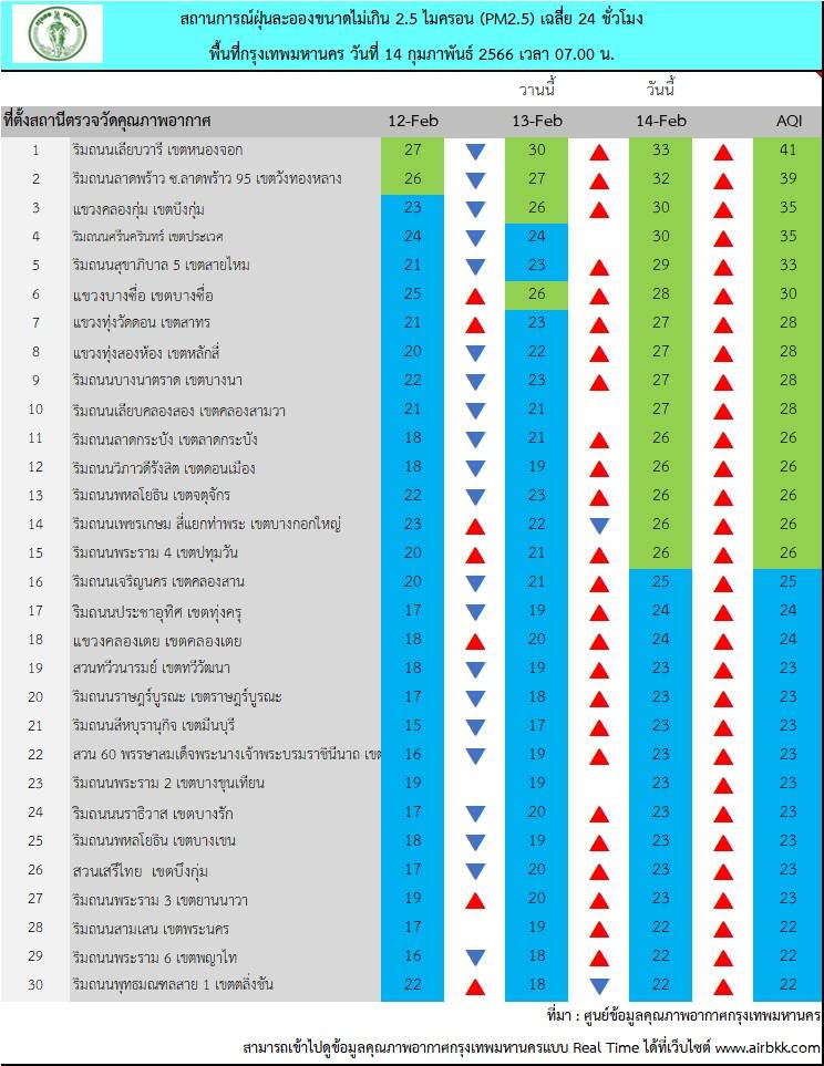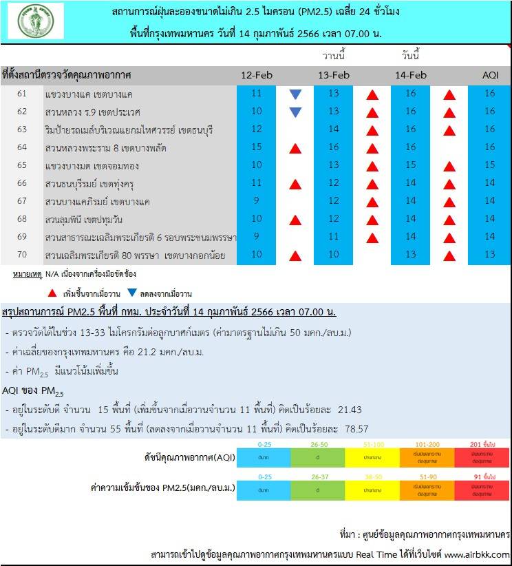 กรุงเทพฯ-ศูนย์ข้อมูลคุณภาพอากาศกรุงเทพมหานคร สรุปผลการตรวจวัด PM2.5 วันที่ 14 กุมภาพันธ์ 2566 เวลา 05.00-07.00 น. (3 ชั่วโมงล่าสุด) - ตรวจวัดได้ 13-33 มคก./ลบ.ม. - ค่าเฉลี่ยของกรุงเทพมหานคร 21.0 มคก./ลบ.ม.