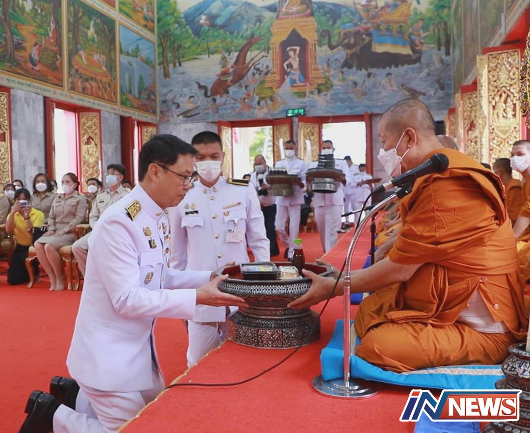 ร้อยโท ทศพล ไชยโกมินทร์ ผู้ว่าราชการจังหวัดกาญจนบุรี ประธานในพิธีได้จุดธูปเทียนเครื่องนมัสการบูชาพระรัตนตรัย เปิดกรวยกระทงดอกไม้ธูปเทียนแพเบื้องหน้าพระบรมฉายาลักษณ์พระบาทสมเด็จพระเจ้าอยู่หัว และเปิดกรวยกระทงดอกไม้ธูปเทียนแพเบื้องหน้าพระบรมฉายาลักษณ์สมเด็จพระเจ้าลูกเธอ เจ้าฟ้าพัชรกิติยาภา นเรนทิราเทพยวดี กรมหลวงราชสาริณีสิริพัชร มหาวัชรราชธิดา รับศีล ต่อจากนั้นประธานในพิธีฯถวายภัตตาหารและสิ่งของพระราชทานแด่ประธานสงฆ์ และข้าราชการ ประชาชน ร่วมถวายภัตตาหารและสิ่งของพระราชทานแด่พระภิกษุและสามเณรที่เหลือจนครบ เป็นอันเสร็จพิธี