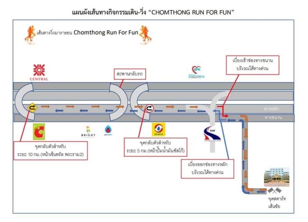 เส้นทางการเดิน-วิ่งเริ่มต้นจากสำนักงานเขตจอมทอง ตรงออกสู่ถนนพระรามที่ 2 (หน้าปากซอยพระรามที่ 2 ซอย 3) ใช้ช่องทางซ้ายไปจนถึงบริเวณพระรามที่ 2 ซอย 19 จากนั้นเบี่ยงเข้าขวามือ บริเวณทางแยกเพื่อตัดเข้าสู่ถนนเส้นหลัก แล้วตรงผ่านสะพานกลับรถเกือกม้าที่ 1 (วัดยายร่ม) ผ่านห้างเดอะไบร์ทไปจนถึงเกือกม้าที่ 2 (บริเวณห้างเซ็นทรัล พระราม 2) แล้ววิ่งวนกลับในเส้นทางเดิม เพื่อกลับสู่เส้นชัยที่สำนักงานเขตจอมทอง