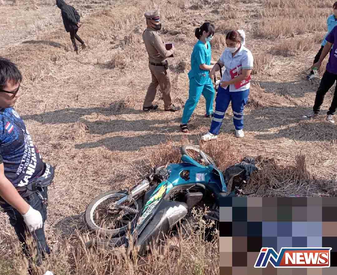 ผู้เฒ่าวัย70ขี่รถจยย.กลับบ้านรถเกิดแหกโค้งเสียหลักพลิกคว่ำคอหักเสียชีวิต