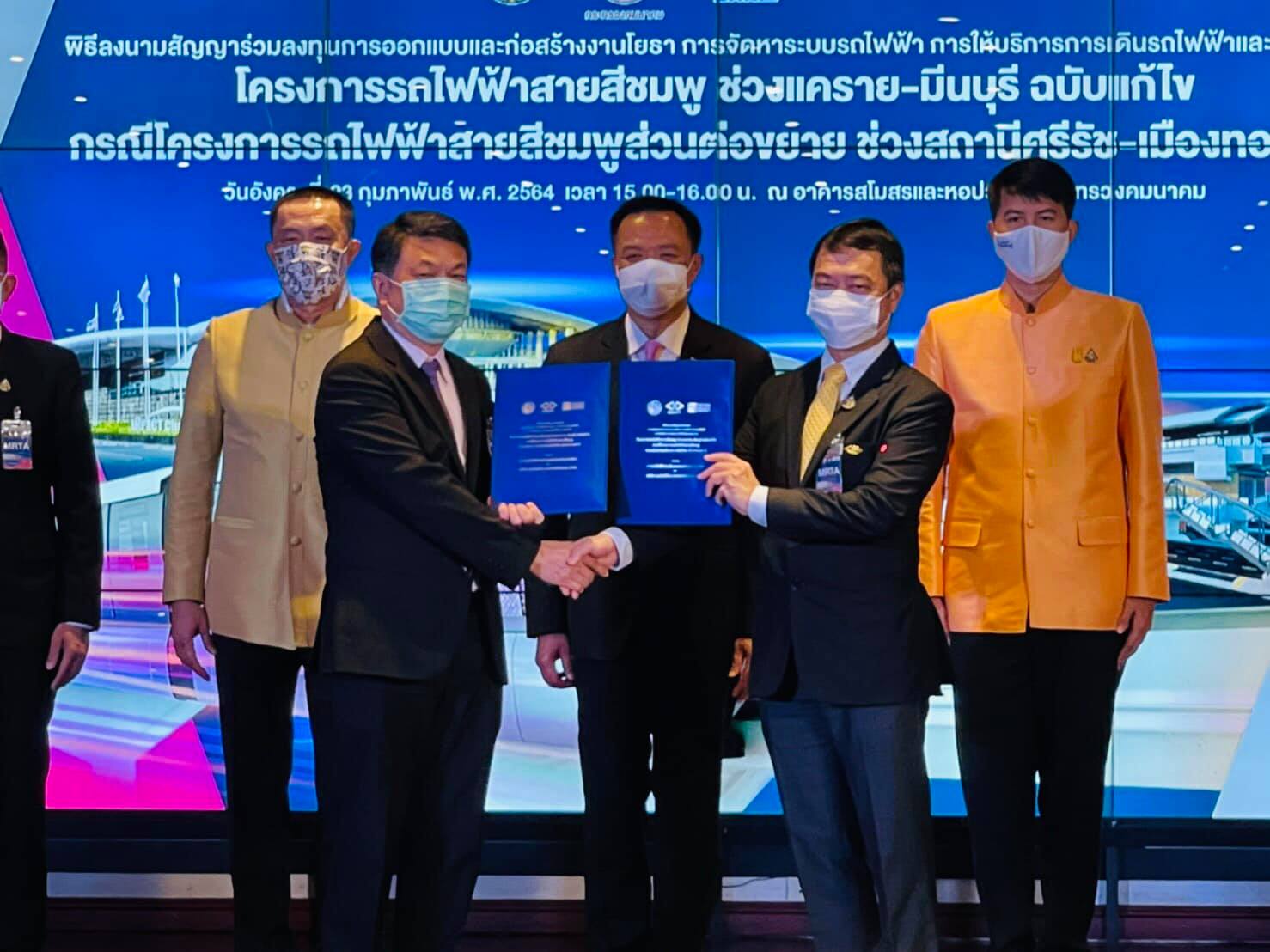 วันอังคารที่ 23 กุมภาพันธ์ 2564 ณ อาคารสโมสร กระทรวงคมนาคม นายอธิรัฐ รัตนเศรษฐ รัฐมนตรีช่วยว่าการกระทรวงคมนาคม และท่านผู้บริหารกระทรวงฯ ร่วมเป็นสักขีพยานโดยได้รับเกียรติจากท่านรองนายกรัฐมนตรี(นายอนุทิน ชาญวีรกูล) เป็นประธานในพิธีลงนามสัญญาร่วมลงทุนการออกแบบและก่อสร้างงานโยธา การจัดหาระบบรถไฟฟ้า การให้บริการการเดินรถไฟฟ้า และซ่อมบำรุงรักษา โครงการรถไฟฟ้าสายสีชมพู ช่วงแคราย - มีนบุรี ฉบับแก้ไขกรณีโครงการส่วนต่อขยาย ช่วงสถานีศรีรัช - เมืองทองธานี