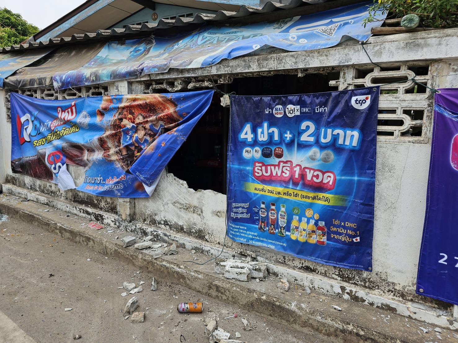 ตุ๊กตุ๊กแหกโค้งพลิกคว่ำพุ่งชนกำแพงร้านค้าวงแตกขณะกำลังกินข้าว