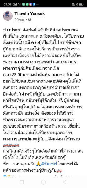ซึ่งผู้ก่อเหตุเป็นถึงลูกผู้ใหญ่บ้าน ไม่สมควรจะกระทำดังกล่าวเป็นอย่างยิ่ง จึงของดให้บริการชั่วคราว จนกว่าเจ้าหน้าที่ตำรวจ และ ผู้นำชุมชนจะมีมาตรการ หรือ สร้างความเชื่อมั่นในความปลอดภัยในชีวิตของบุคคลากรทางการแพทย์และกู้ภัย จึงแจ้งมาให้ทราบ