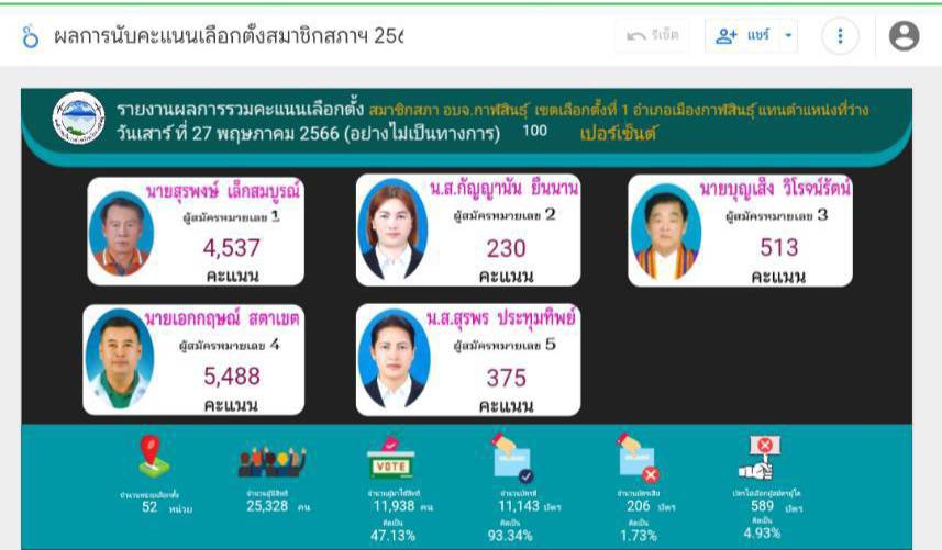 วันที่ 28 พฤษภาคม 2566 ผู้สื่อข่าวรายงานว่า ตามที่คณะกรรมการการเลือกตั้งประจำองค์การบริหารส่วนจังหวัดกาฬสินธุ์ ได้กำหนดให้มีการเลือกตั้งสมาชิกสภาองค์การบริหารส่วนจังหวัดกาฬสินธุ์ (ส.อบจ.) จำนวน 3 เขตเลือกตั้ง ใน 3 อำเภอ คือ อ.เมืองกาฬสินธุ์ เขต 1, อ.ยางตลาด เขต 3 และ อ.กุฉินารายณ์ เขต 3 เนื่องจาก ส.อบจ.ทั้ง 3 เขตดังกล่าว ลาออกไปสมัคร ส.ส. โดยมีการเลือกตั้งซ่อมเมื่อวานนี้ (27 พ.ค.66) ซึ่งการจัดการเลือกตั้งทุกขั้นตอน ดำเนินไปด้วยความเรียบร้อย สามารถประกาศผลคะแนนอย่างไม่เป็นทางการ เมื่อเวลาประมาณ 20.00 น.ของวันที่ 27 พ.ค.66 ที่ผ่านมา
