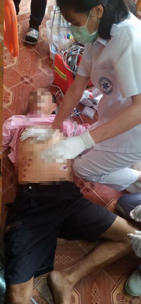 เมื่อไปถึงบริเวณที่เกิดเหตุ เป็นบ้านปูนชั้นเดียวมีชาวบ้านมุงดูจำนวนมาก บริเวณหน้าบ้านพบคนนอนได้รับบาดเจ็บทราบชื่อคือ นายวิเชียร กาศเกษม อายุ 68 ปี ได้รับบาดเจ็บที่บริเวณชายโครงด้านขวา มีรอยกระสุน จำนวน 9 รู อาการสาหัส เจ้าหน้าเร่งช่วยเหลือ ปั้มหัวใจ CPR และรีบนำส่ง รพ.แพร่ ในที่เกิดเหตุพบนายชวน สุวรรณกาศ อายุ 79 ปี ซึ่งเป็นพี่ชาย ได้รับบาดเจ็บที่ศรีษะและมือ เจ้าหน้าที่เร่งทำการปฐมพยาบาล และนำทั้งคู่ส่งรักษาที่โรงพยาบาลแพร่ต่อไป