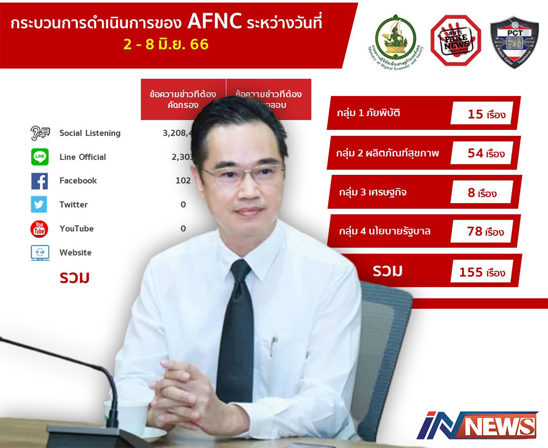 นายเวทางค์ พ่วงทรัพย์ รองปลัดกระทรวงดิจิทัลเพื่อเศรษฐกิจและสังคม (ดีอีเอส) ในฐานะโฆษกกระทรวงฯ ฝ่ายข้าราชการประจำ กล่าวถึง ผลการมอนิเตอร์และรับแจ้งข่าวปลอมของศูนย์ต่อต้านข่าวปลอม ระหว่างวันที่ 2 – 8 มิถุนายน 2566 พบข้อความที่เข้ามาทั้งหมด 3,210,839 ข้อความ โดยมีข้อความที่ต้องดำเนินการตรวจสอบ (Verify) ทั้งสิ้น 236 ข้อความ ทั้งนี้ช่องทางที่มีการพบเบาะแสมากที่สุด คือ ข้อความที่มาจาก Social Listening จำนวน 233 ข้อความ ตามมาด้วยการแจ้งเบาะแสผ่าน Line Official จำนวน 13 ข้อความ รวมเรื่องที่ต้องดำเนินการตรวจสอบทั้งหมด 155 เรื่อง และจากการประสานงานกับหน่วยงานที่เกี่ยวข้อง ได้รับผลการตรวจสอบกลับมาแล้ว 88 เรื่อง