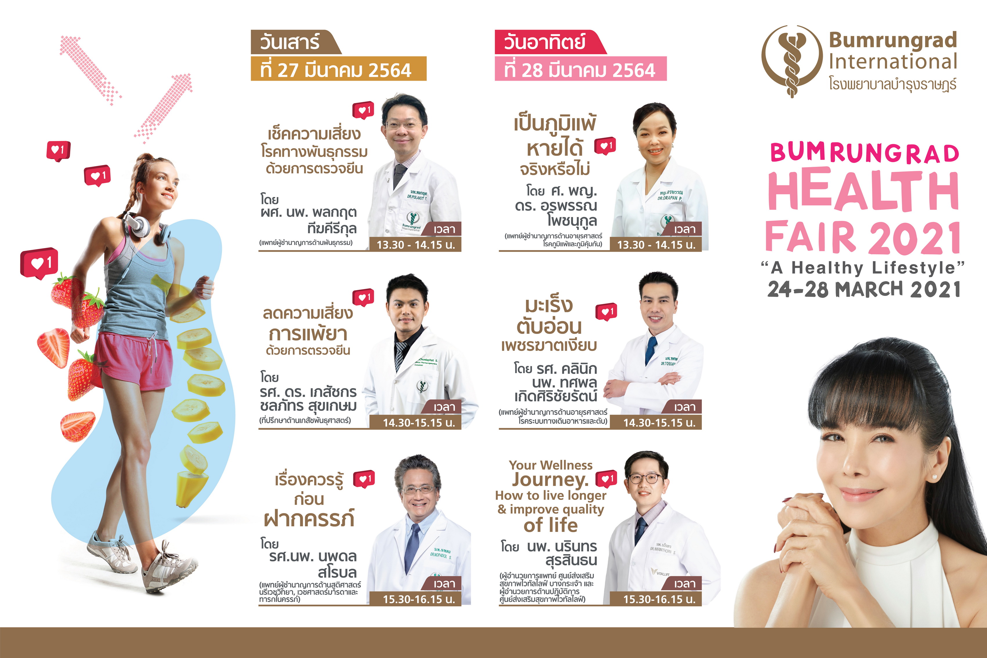 กรุงเทพฯ-โรงพยาบาลบำรุงราษฎร์ กลับมาอีกครั้งตามคำเรียกร้อง เอาใจคนรักสุขภาพ จัดมหกรรมสุขภาพ Bumrungrad Health Fair 2021 “A Healthy Lifestyle” สร้างความตระหนักรู้แก่ประชาชนเพื่อการดูแลสุขภาพที่ดีแบบองค์รวม พร้อมเชิญชวนผู้รักสุขภาพเข้าร่วมงาน ในวันที่ 24 – 28 มีนาคม 2564 เวลา 10.00 - 20.00 น. ณ ศูนย์การค้าเซ็นทรัล เอ็มบาสซี ชั้น G