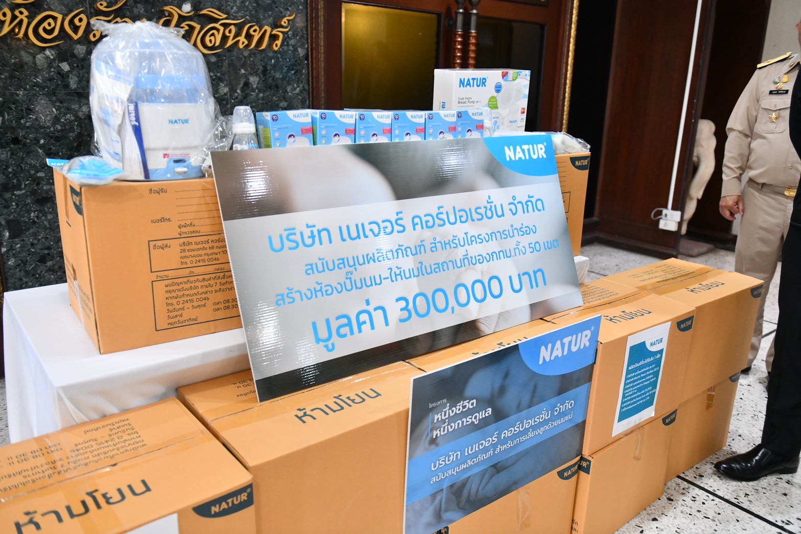 กรุงเทพฯ-(7 ส.ค. 66) ณ หน้าห้องรัตนโกสินทร์ ศาลาว่าการกรุงเทพมหานคร (เสาชิงช้า) นายชัชชาติ สิทธิพันธุ์ ผู้ว่าราชการกรุงเทพมหานคร พร้อมด้วยผู้บริหารกรุงเทพมหานคร รับมอบผลิตภัณฑ์สำหรับโครงการนำร่องสร้างห้องปั๊มนม-ให้นม ในสถานที่ของกทม.ทั้ง 50 เขต ประกอบด้วย ชุดปั๊มนมไฟฟ้า เครื่องนึ่งขวดนม ขวดนม ถุงเก็บน้ำนม และแผ่นซับน้ำนม รวมทั้งสิ้น 50 ชุด มูลค่า 300,000 บาท จากนายทวี เอกสุวรรณเจริญ ประธานกรรมการบริหารบริษัท เนเจอร์ คอร์ปอเรชั่น จำกัด ผู้ผลิตและจัดจำหน่ายสินค้าเด็กอ่อนแบรนด์เนเจอร์
