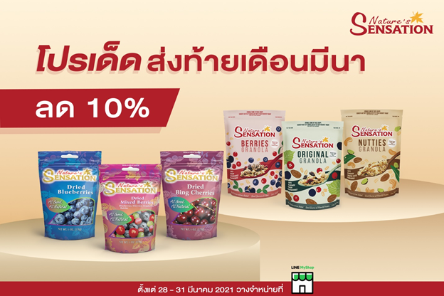 เนเจอร์ เซ็นเซชั่น แบรนด์ผลิตภัณฑ์ธัญพืช ผลไม้อบแห้ง และน้ำผลไม้ออร์แกนิกโดยเครือเฮอริเทจ จัดโปรโมชั่นพิเศษเอาใจสายสแน็คเพื่อสุขภาพด้วยผลไม้อบแห้งคุณภาพทุกรายการ ลด10% พร้อมด้วยเซ็นเซชั่น กราโนล่า (ทุกรสชาติ) ขนาด 454 กรัม ในราคาเพียง 194 บาท