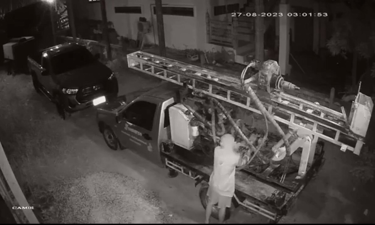 โดยนายอลงกรณ์ ได้เล่าว่า ในวันเกิดเหตุเป็นคืนวันที่ 27 สิงหาคม 2566 เวลาประมาณ 02.50 น.ได้มีคนร้ายสวมเสื้อแขนยาว นุ่งกางเกงขาสั้นชาย ใช้เสื้อมัดปิดบังใบหน้า เข้ามาขโมยแบตเตอรี่จากรถเจาะน้ำบาดาลของทางร้านไปจำนวน 2 ลูก ซึ่งก่อนหน้านี้รถเจาะบาดาลคันดังกล่าวได้จอดอยู่ด้านในสุด แล้วจะมีรถปั๊มลมและรถปิคอัพอีกคันจอดบังหน้าไว้ แต่ในวันเกิดเหตุพนักงานของทางร้านได้เอารถเจาะน้ำบาดาลออกมาล้างทำความสะอาด ก่อนที่คนร้ายจะมาขโมยไป