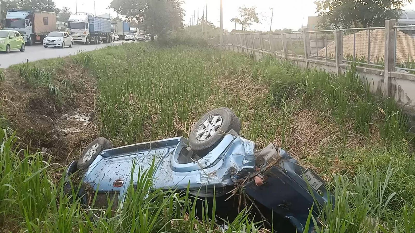 ที่เกิดเหตุบนถนนสายบางเลน-นพวงษ์ เขตพื้นที่ม.13 ต.บางภาษี อ.บางเลน จ.นครปฐม ใกล้ปั้มน้ำมัน ปตท บางภาษี พบรถกระบะดีแม็ก 4 ประตูสีฟ้าพลิกค่ำตกข้างถนนทะเบียน บธ 403 พระนครศรีอยุธยาสภาพรถเสียหายทั้งคันส่วนคนที่นั่งมาด้วยได้รับบาดเจ็บที่ศรีษะนำตัวส่งโรงพยาบาลบางเลนทราบชื่อคนขับรถกระบะ d-max นายชัยมงคล ธนิกุล อายุ 43 ปี ชาวอยุธยาห่างออกมาประมาณ100เมตรพบรถบรรทุกรถ mazda หมายเลขทะเบียน บล 9033 นครปฐมสภาพด้านหน้าชนท้ายรถตู้โดยสารส่วนคนขับรถได้บาดเจ็บสาหัสทางเจ้าหน้าที่มูลนิธินครปฐมจุดบางเลนรีบนำตัวส่งโรงพยาบาลบางเลนด้านหน้ารถมาสด้าพบรถตู้รถตู้โดยสารสีขาวสายม.เกษตรกำแพงแสน-หมอชิดมีผู้โดยสารเป็นนักศึกษาและประชาชน9 รายได้รับบาดเจ็บ5 ราย ส่วนคนขับทราบชื่อนาย จิระวัฒน์ เอี่ยมอ่อน อายุ 43 ปีขับรถโดยสารหมายเลขทะเบียน 15-3868 กรุงเทพมหานครสภาพรถด้านหน้ายุบมาถึงห้องผู้โดยสารส่วนผู้บาดเจ็บนำตัวส่งโรงพยาบาลบางเลนและพบรถบรรทุกพ่วง 18 ล้อลูกพ่วง 18 ล้อหมายเลขทะเบียน 88-2019 นครปฐมถูกรถตู้โดยสารชนด้านข้างส่วนคนขับไม่ได้รับบาดเจ็บแต่อย่างใดในส่วนรถเกิดอุบัติเหตุกีดขวางการจราจร 1 ช่องทางทำให้รถที่สัญจรผ่านเข้าไปแยกนพวงษ์ที่จะเข้า กทม มีรถสะสมจำนวนมากระชะลอตัวยาวกว่า 3 กิโลเมตรทางเจ้าหน้าที่ตำรวจสภ.บางเลน ตำรวจทางหลวง สายตรวจตำบลบางภาษี ตำรวจจราจรบางเลนและเจ้าหน้าที่อาสามูลนิธิสุขศาลานุเคราะห์นครปฐมจุดบางเลนใช้สัญญาณมือโบกรถเร่งระบายพร้อมทั้งประสานรถยกเร่งนำรถที่เกิดอุบัติเหตุออกจากช่องการจราจรใช้เวลากว่า 1 ชั่วโมงสามารถคืนช่องจราจรให้กับผู้ใช้รถใช้ถนนได้อย่างปกติ