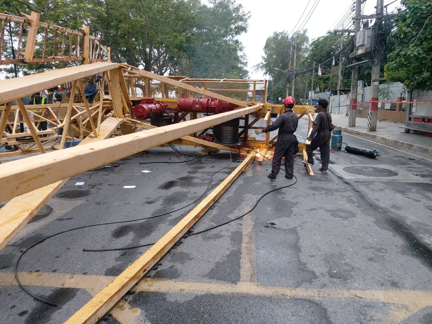 ทางบริษัทผู้รับเหมาจะดำเนินการเคลื่อนย้ายซากแขนบูมของเครนก่อสร้างตัวเก่าซึ่งมีน้ำหนักประมาณ 300 ตัน ที่หักล้มลงบนยอดตึกลงมายังด้านล่างแล้วเสร็จ และจะเคลื่อนย้ายออกไปได้ภายในเวลาประมาณ 10.00 น. หลังจากตลอดทั้งคืนที่ผ่านมานั้น ทางผู้รับเหมาได้ดำเนินการถอดชิ้นส่วนแยกก้านแขนบูมออกจากกัน และใช้รถเครนขนาดใหญ่ทำการทยอยยกลงมากองไว้ยังที่พื้นด้านล่าง บนถนนมรุพงษ์ หน้าโรงพยาบาล ซึ่งหลังจากทางผู้รับเหมาทำการเคลื่อนย้ายซากเครนออกไปจากพื้นที่ได้แล้ว จะสามารถเปิดการจราจรได้ต่อไป พ.ต.ท.เตชทัต ระบุ