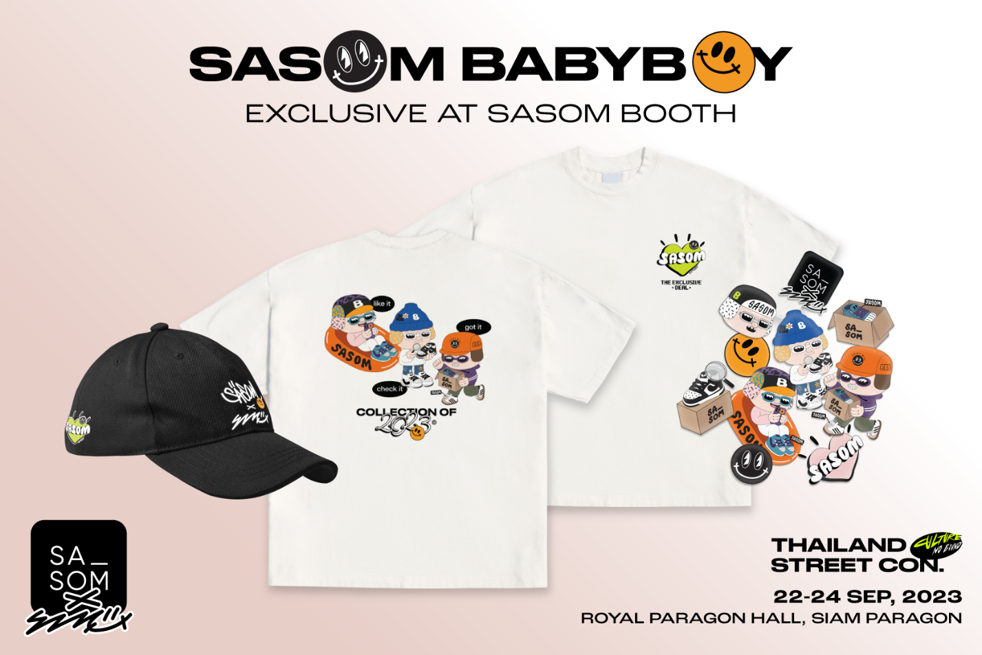 SASOM (สะสม) แพลตฟอร์มที่รวมสินค้าแฟชั่นไอเท็มแบรนด์ดังและของสะสมมากกว่า 500,000 รายการ ร่วมคอลแลบส์กับศิลปิน illustrator ขวัญใจวัยรุ่น “Stupidnoopmacc” เจ้าของคาแรคเตอร์ “BABYBOY” ออกสินค้าคอลเลคชัน Limited “SASOM BABYBOY” ชวนมาช้อปกันแบบจัดหนักจัดเต็ม ในงานสตรีทคัลเจอร์เฟสติวัลที่ “Thailand Street Con 2023” ณ บูธ SASOM รอยัล พารากอน ฮอลล์ สยามพารากอน วันที่ 22 - 24 กันยายน 2566 นี้