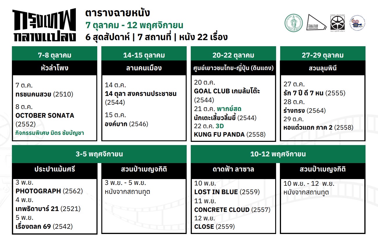 กรุงเทพมหานคร ร่วมกับ สมาคมผู้กำกับภาพยนตร์ไทย หอภาพยนตร์ (องค์การมหาชน) และสมาคมหนังกลางแปลงแห่งประเทศไทย จัดงานเทศกาล “กรุงเทพกลางแปลง” ระหว่างวันที่ 7 ตุลาคม – 12 พฤศจิกายน 2566 กับ 6 สุดสัปดาห์ 7 สถานที่ หนัง 22 เรื่อง โดยมีตารางฉายหนังดังนี้