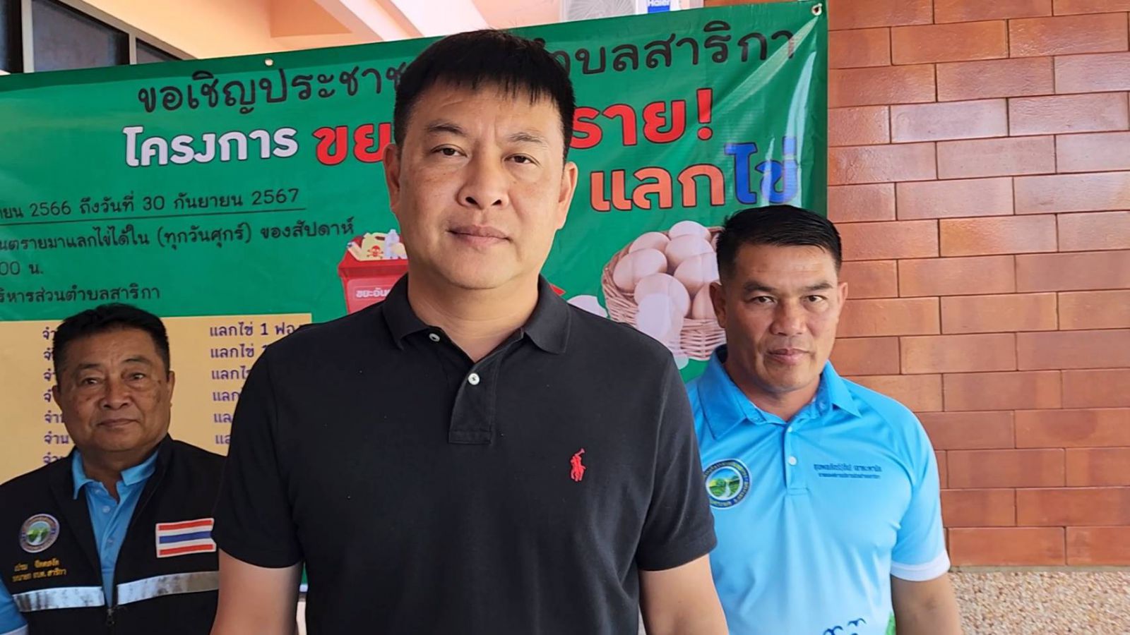 นายชุมพลภัทร์ เลาหะพานิช นายก อบต.สาริกา บอกว่า โครงการนี้เป็นโครงการนำขยะอันตรายแลกไข่ไก่ เป็นโครงการที่มีอยู่เดิมก่อนแล้วโดยมีนางสาวศิริรัตน์ กำพุด หัวหน้าสำนักปลัดฯเป็นคนคิดโครงการตอนแรกก่อนที่ตนจะเข้ารับตำแหน่งนายกอบต. ตนเห็นว่าดีจึงให้มีการทำโครงการนี้ต่อไปเพื่อเป็นการช่วยเหลือชาวบ้านในพื้นที่ตำบลสาริกา อีกทั้งเป็นการนำขยะไปทำลายได้อย่างถูกวิธี