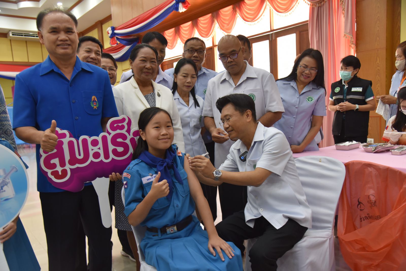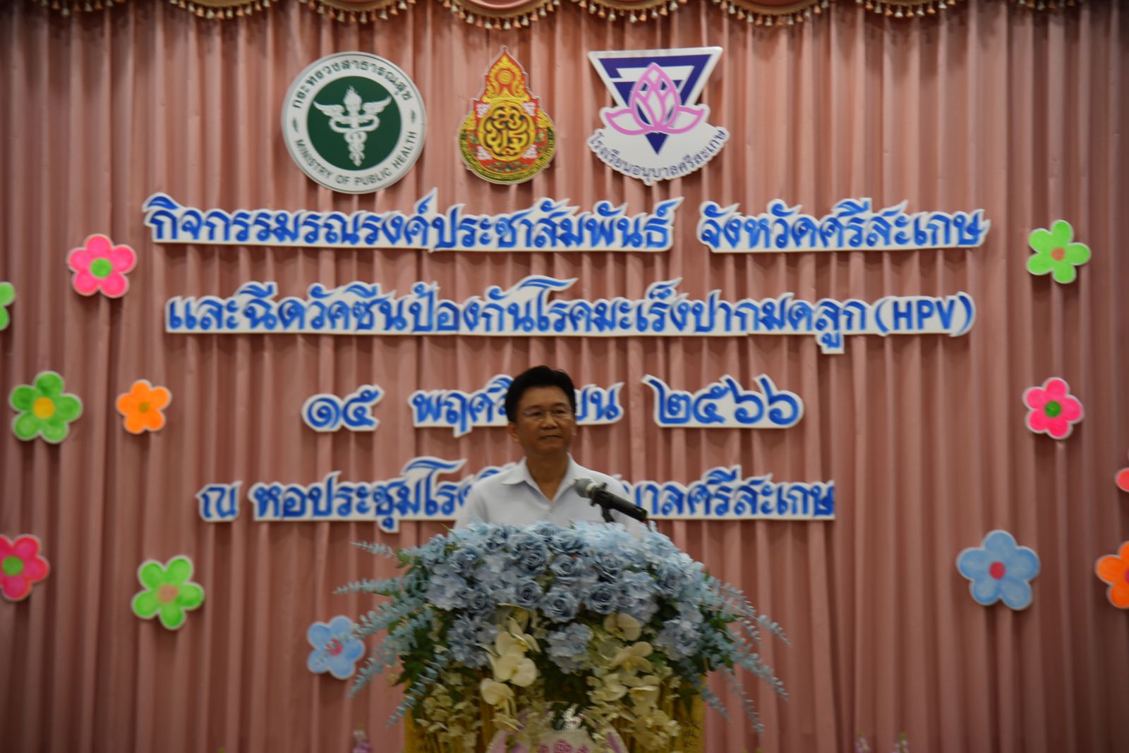 เมื่อวันที่ 15 พฤศจิกายน 2566 ที่หอประชุมโรงเรียนอนุบาลศรีสะเกษ น.พ.ทนง วีระแสงพงษ์ นายแพทย์สาธารณสุขจังหวัดศรีสะเกษ เป็นประธานเปิดกิจกรรมประชาสัมพันธ์และรณรงค์ฉีดป้องกันมะเร็งปากมดลูก (HPV) โดยมี น.พ.เสกสรร จวงจันทร์ รองนายแพทย์สาธารณสุขจังหวัดศรีสะเกษ พร้อมด้วยบุคลากรทางการแพทย์และสาธารณสุข รวมทั้งบุคลากรหน่วยงานทางการศึกษาในจังหวัดศรีสะเกษ นำนักเรียนหญิงโรงเรียนอนุบาลศรีสะเกษชั้นประถมศึกษาปีที่ 5-6 จำนวน 439 คน และได้รับความอนุเคราะห์สถานที่และอำนวยความสะดวกจากโรงเรียนอนุบาลศรีสะเกษ ทีมพยาบาลให้บริการฉีดวัคซีนจากโรงพยาบาลศรีสะเกษ และเทศบาลเมืองศรีสะเกษ ทีมจัดกิจกรรมจากกลุ่มงานควบคุมโรคติดต่อ และกลุ่มงานคุ้มครองผู้บริโภคสำนักงาน สาธารณสุขจังหวัดศรีสะเกษ