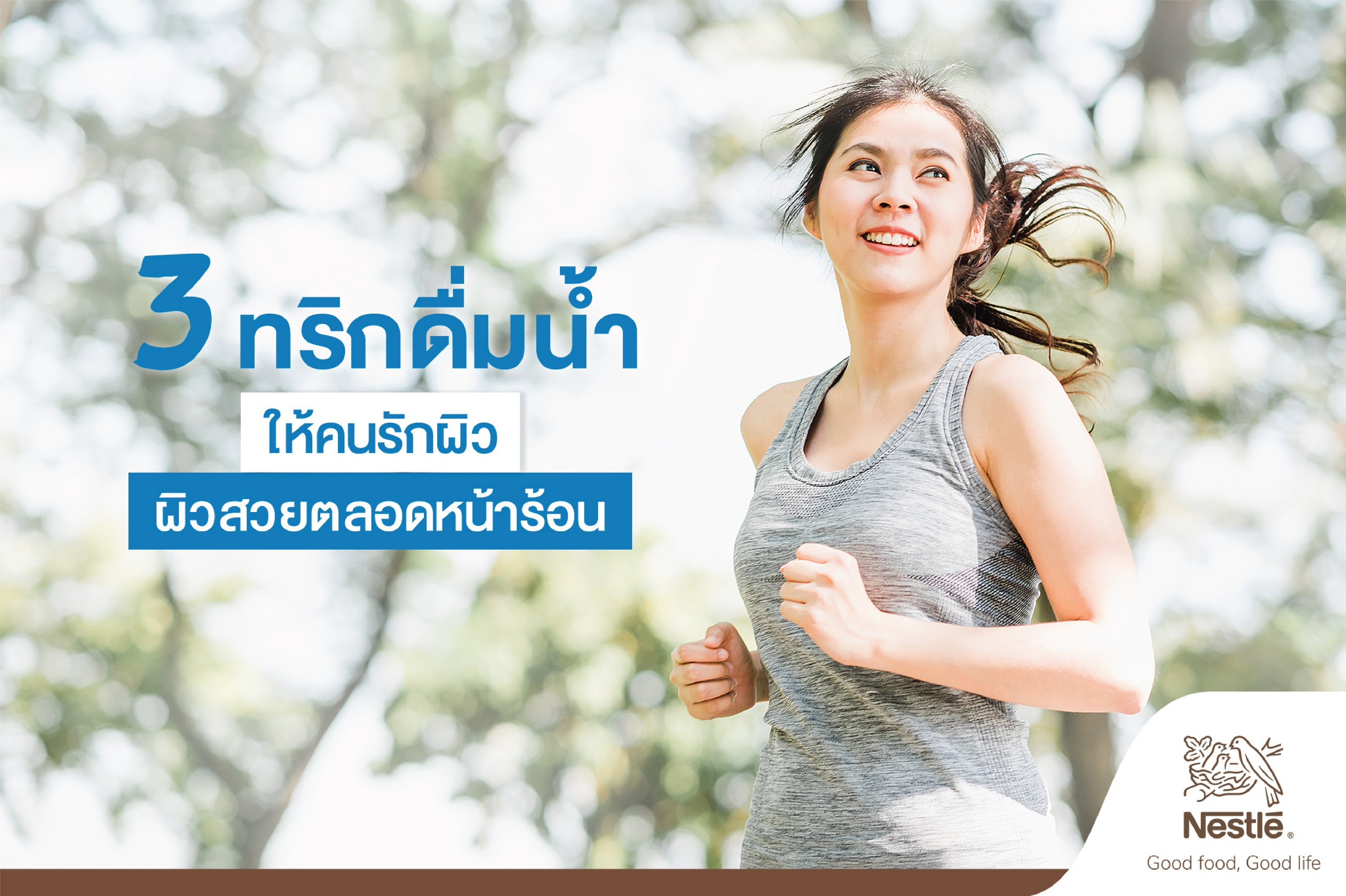 เพิ่มความกระชับของผิวได้6,8 นอกจากนั้น การดื่มน้ำยังช่วยขับสารพิษและของเสียออกจากร่างกายผ่านทางเหงื่อ ซึ่งจะช่วยป้องกันการสะสมของสารพิษในชั้นผิวหนังได้ การดื่มน้ำจึงนับได้ว่าเป็นตัวเลือกที่ดีสำหรับช่วยในการฟื้นฟูร่างกายและผิวพรรณของเราเป็นอย่างดี”