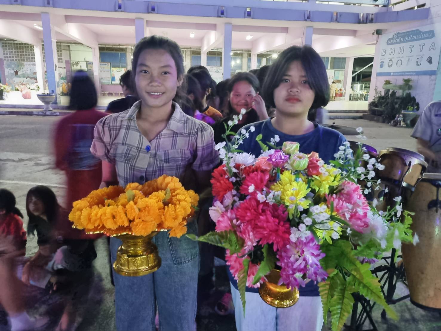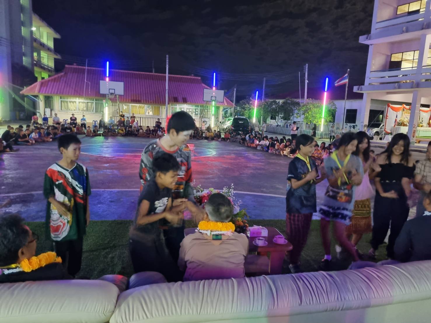 จากนั้นเนตรนารี ผู้ถือพวงมาลัยและถือพุ่มฉลากหยุดยืน หน้าประธาน บุคคลอื่นๆ เนตรนารีผู้ถือพวงมาลัย ได้ส่งพวงมาลัยให้แก่ประธานก่อน ผู้ถือฉลากส่งให้ประธานภายหลัง เสร็จแล้วกลับเข้าที่นั่งของตน ก่อนจะมีการแสดง ของลูกเสือ – เนตรนารี แต่ละหมู่ใช้เวลาประมาณ 10 นาที ได้มีการแสดงประกอบจังหวัของผ฿กำกับ , การกล่าวชมเชยหลังการแสดง จรดดึกพิธีกรได้เชิญ ดร. จุฑาธิบดิ์ ศรีวรัญญุตานนท์ รองผู้อำนวยการสถานศึกษา ผู้แทนประธานกล่าวปิด