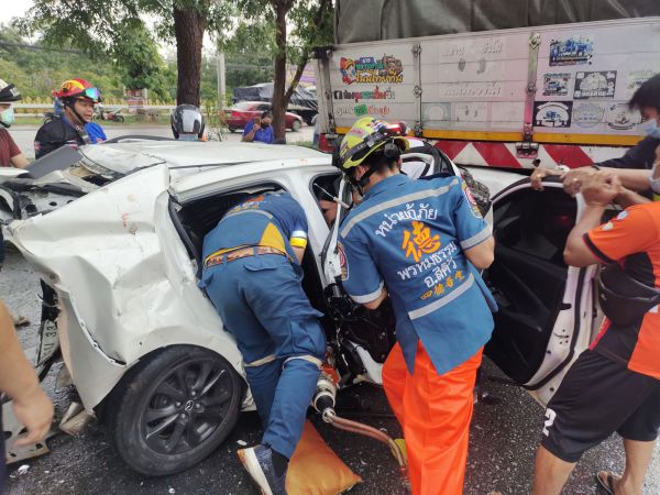 นครราชสีมา-หนุ่มควบกระบะเสียหลักพุ่งชนท้ายรถเก๋งก่อนกระเด็นยัดท้ายสิบล้อเด็ก 3 ขวบขาติดภายในกู้ภัยช่วยอย่างทุลักทุเล