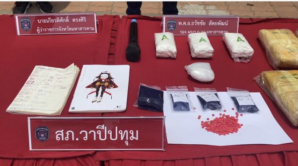 เวลา 12.00 น. วันที่ 24 เม.ย. 64 ที่จุดตรวจ ต 06 ต. หนองแสง อ.วาปีปทุม จ.มหาสารคาม นายเกียรติศักดิ์ ตรงศิริ ผู้ว่าราชการจังหวัดมหาสารคาม พ.ต.อ.ธวัชชัย สัตยพัฒน์ รอง ผบก.ภ.จว.มหาสารคาม พ.ต.อ.ชินวัฒน์ ศรีสวัสดิ์ ผกก.สภ.วาปีปทุม พร้อมชุดปราบปรามยาเสพติด สภ.วาปีปทุม ร่วมกันแถลงผลการจับกุม นายธิติชัย แซ่อึ้ง อายุ 38 ปี บ้านเลขที่ 351 หมู่ที่ 3 ต.แวงใหญ่ อ.แวงใหญ่ จ.ขอนแก่น และนายภาณุเดช สันดี อายุ 22 ปี อยู่บ้านเลขที่ 20/1 หมู่ที่ 6 ต.บ้านหัน อ.โนนศิลา จ.ขอนแก่น พร้อมด้วยของกลาง ยาบ้า จำนวน 96,743 เม็ด , ยาไอซ์ ปริมาณน้ำหนัก 96.00 กรัม , อาวุธปืน พกสั้น ยี่ห้อ CZ 97 B ขนาด .45 มม. จำนวน 1 กระบอก , เครื่องกระสุนปืนขนาด .45 มม.จำนวน 9 นัด , รถยนต์เก๋ง ยี่ห้อเบนซ์ รุ่น C 180 สีขาว หมายเลขทะเบียน 3 กส 7472 กทม. และโทรศัพท์ใช้ในการติดต่อซื้อขายจำหน่ายยาบ้าจำนวน 3 เครื่อง โดยกล่าวหาว่า เสพและร่วมกันมียาเสพติดให้โทษประเภท 1 (เมทแอมเฟตามีนหรือยาบ้าและยาไอซ์) ไว้ในครอบครองเพื่อจำหน่ายโดยผิดกฎหมาย,ร่วมกันมีและพาอาวุธปืนและเครื่องกระสุนปืนไปในเมือง หมู่บ้าน ทางสาธารณะโดยไม่มีเหตุอันควรและไม่ได้รับอนุญาตจากนายทะเบียนท้องที่ โดยจับกุมที่บริเวณถนนสาย วาปีปทุม – มหาสารคาม หมู่ที่ 1 ต.หนองแสง อ.วาปีปทุม จ.มหาสารคาม
