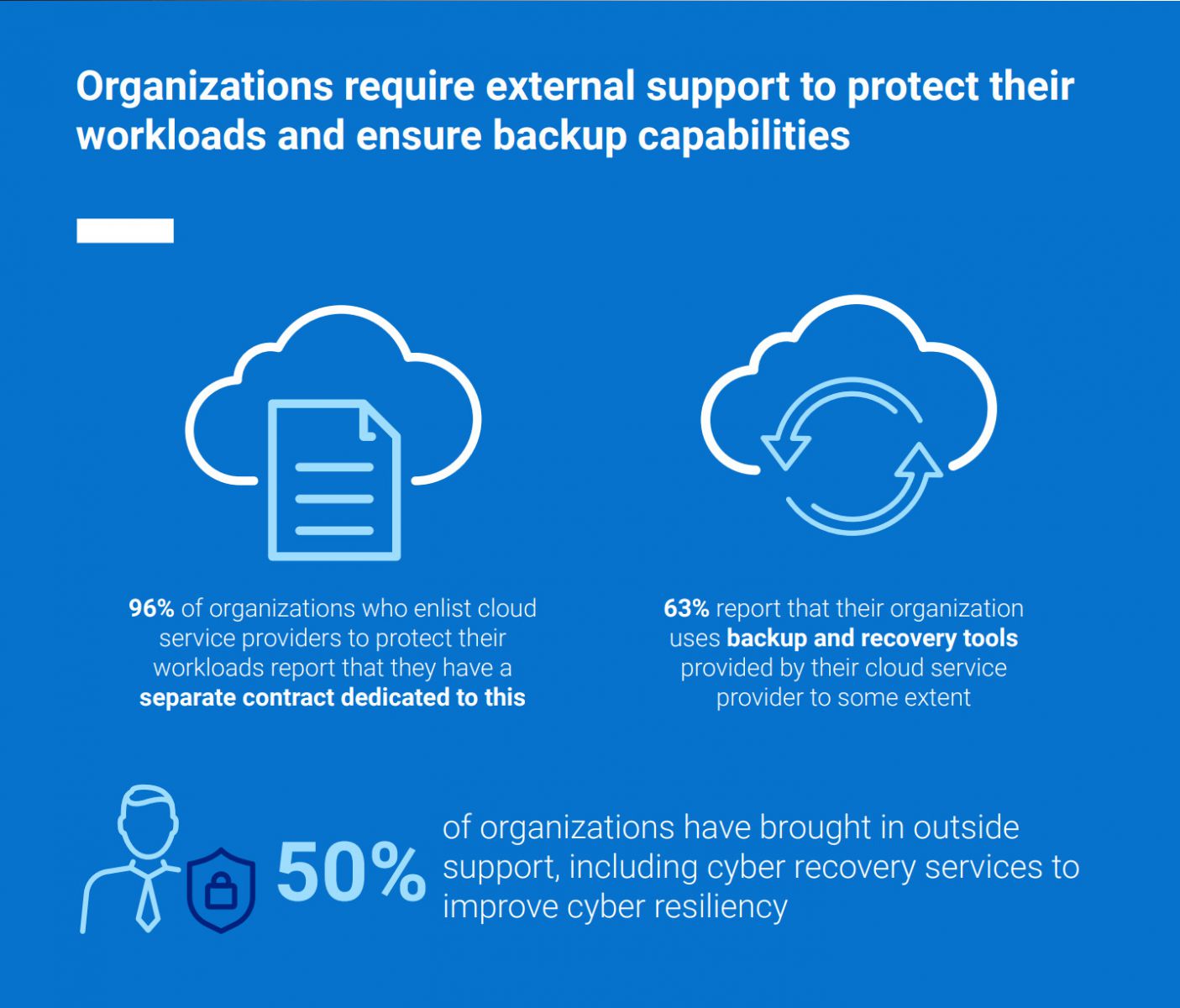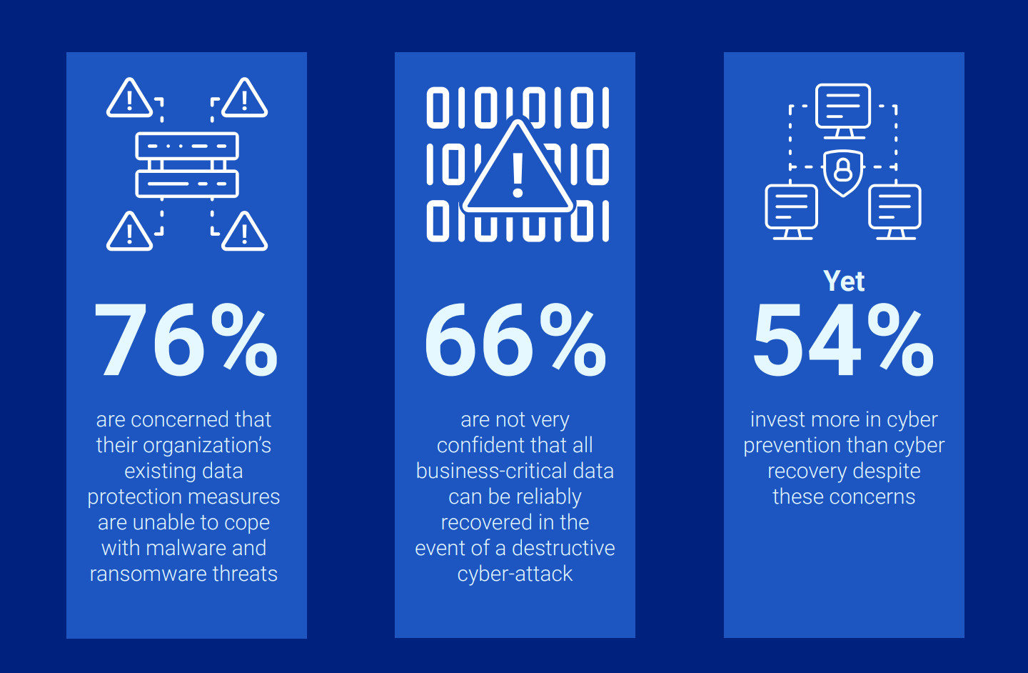 ความกังวลนี้มีหลักฐานสนับสนุนเป็นอย่างดีจากการที่ 76% ขององค์กรที่ตอบแบบสํารวจวิตกว่ามาตรการปกป้องข้อมูลที่มีอยู่เดิมจะไม่สามารถรับมือกับภัยคุกคามจากแรนซัมแวร์ได้ นอกจากนี้ 66% ไม่มั่นใจนักว่าจะสามารถกู้คืนข้อมูลได้กรณีที่เกิดการโจมตีแบบทำลายล้างทางไซเบอร์ ถึงแม้ว่าจะมีมุมมองเช่นนี้ แต่องค์กรส่วนใหญ่ (54%) ยังคงลงทุนมากยิ่งขึ้นในการป้องกันทางไซเบอร์มากกว่าการกู้คืน ดังนั้น จึงจําเป็นต้องพิจารณาหาความสมดุลระหว่างการป้องกันและการกู้คืนอย่างรอบคอบโดยคำนึงถึงความเป็นจริงที่ว่า การโจมตีที่ประสบความสำเร็จในเวลานี้มีแนวโน้มเพิ่มสูงขึ้น