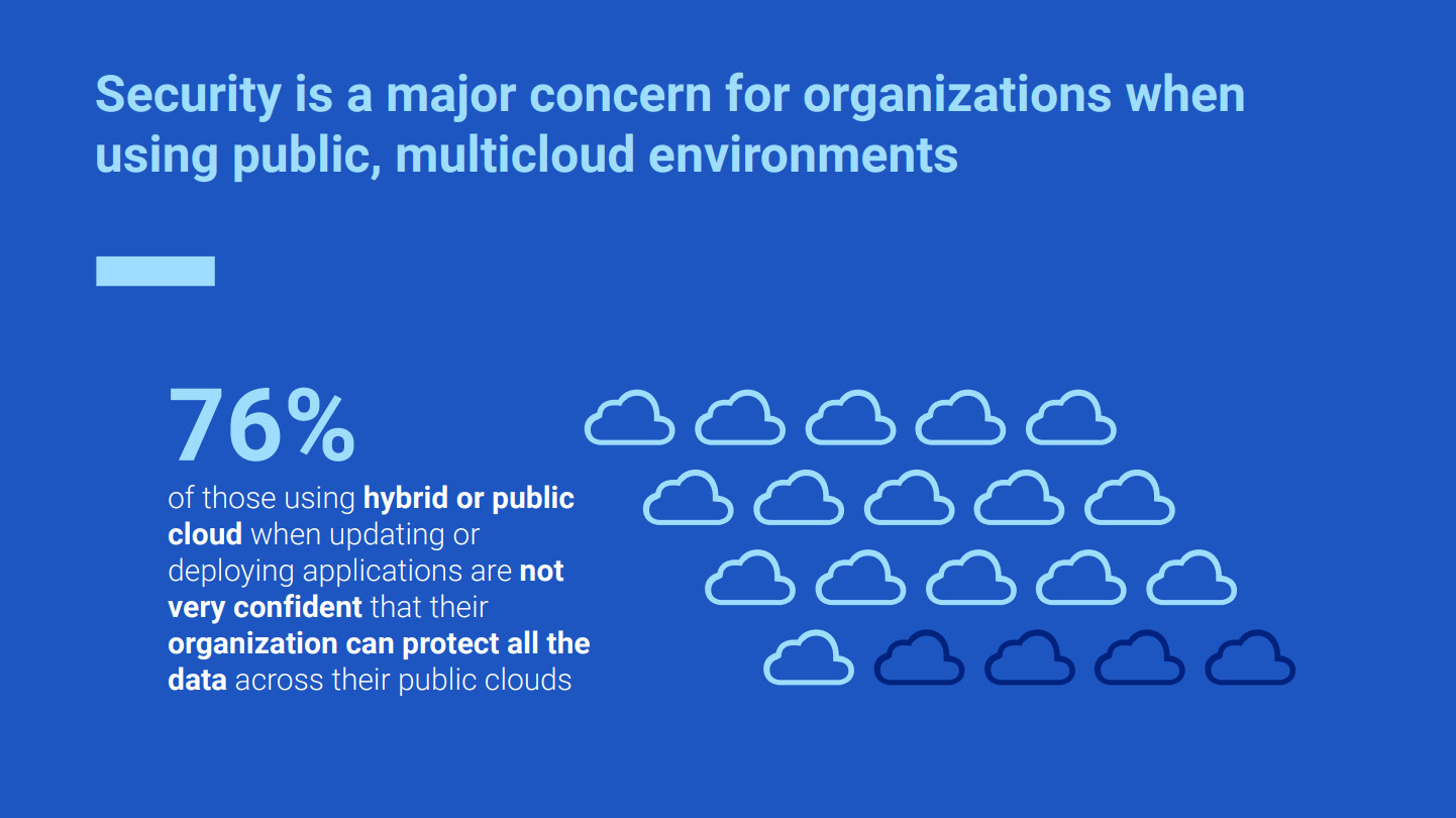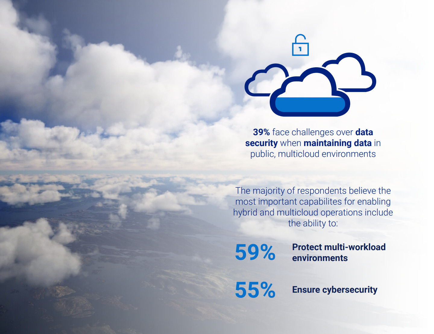 ในขณะที่มัลติ-คลาวด์ยังคงเป็นกลยุทธ์ที่ได้รับการสนับสนุนมากที่สุดสำหรับองค์กรที่กําลังมองหาวิธีในการปรับใช้หรืออัปเดตแอปพลิเคชันต่างๆ การป้องกันข้อมูลยังคงเป็นปัญหาสําคัญ ทั้งนี้ 76% ของผู้มีอำนาจในการตัดสินใจด้านไอที ไม่มั่นใจมากนักว่าองค์กรของตัวเองจะสามารถปกป้องข้อมูลที่มีทั้งหมดในพับบลิคคลาวด์ และ 39% ขององค์กรได้ระบุถึงความท้าทายในด้านความมั่นคงปลอดภัยของข้อมูลทั้งในพับบลิคคลาวด์ และมัลติ-คลาวด์ ดังนั้นการสร้างความมั่นใจในการป้องกันข้อมูลบนมัลติคลาวด์และความมั่นคงปลอดภัยทางไซเบอร์อย่างต่อเนื่องจึงเป็นเรื่องสำคัญอย่างยิ่ง เนื่องจากส่วนใหญ่ (>55%) เชื่อว่าคุณสมบัติเหล่านี้เป็นความสามารถที่สำคัญที่สุดที่เอื้ออำนวยต่อการดำเนินงาน