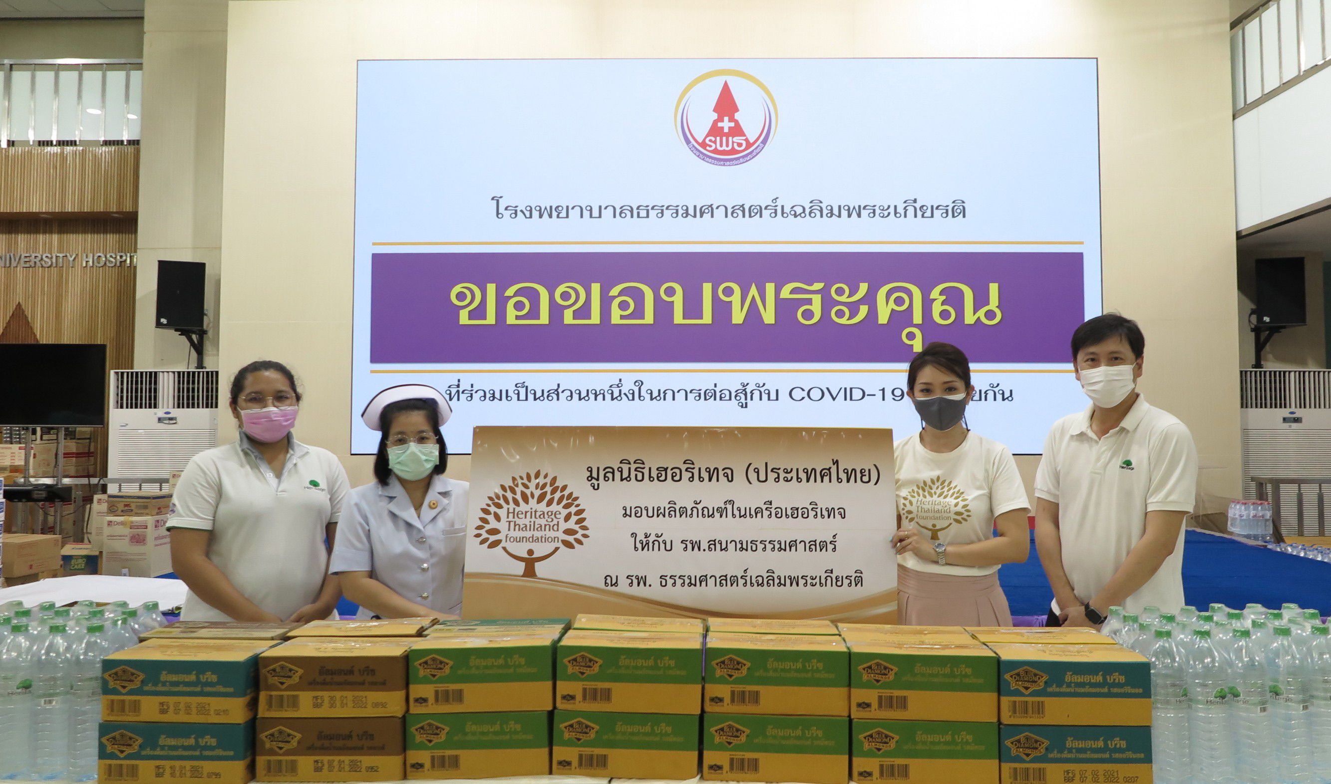 กรุงเทพฯ – มูลนิธิเฮอริเทจ (ประเทศไทย) ภายใต้การดูแลของเครือเฮอริเทจ ผู้ผลิตและจัดจำหน่ายอาหารและเครื่องดื่มเพื่อสุขภาพ มอบผลิตภัณฑ์ภายในเครือ อาทิ เครื่องดื่มน้ำนมอัลมอนด์ เครื่องดื่มน้ำนมพิสทาชิโอ และน้ำดื่มเฮอริเทจ ให้กับโรงพยาบาลสนามธรรมศาสตร์ ซึ่งถูกปรับขึ้นเพื่อรองรับผู้ป่วย และสนับสนุนความพร้อมในด้านสาธารณสุขของภาครัฐ ในช่วงการแพร่ระบาดโควิด-19 ระลอกใหม่ที่มีผู้ป่วยเป็นจำนวนมาก นำโดย วลัยทิพย์ ซื่อตรงมั่นคง (ที่สองจากขวา) ผู้อำนวยการฝ่ายสื่อสารองค์กร และ ธีรวัฒน์ กิตติธนทรัพย์ (ที่หนึ่งจากขวา)ผู้จัดการฝ่ายความปลอดภัยและสิ่งแวดล้อม เครือเฮอริเทจ พร้อมพนักงานในเครือฯ เป็นตัวแทนส่งต่อน้ำใจให้กับบุคลากรทางการแพทย์และผู้ป่วยที่รักษาตัวในโรงพยาบาลสนามธรรมศาสตร์ โดยมีตัวแทนโรงพยาบาลเป็นผู้รับมอบ ณ โรงพยาบาลธรรมศาสตร์เฉลิมพระเกียรติ เมื่อวันก่อน