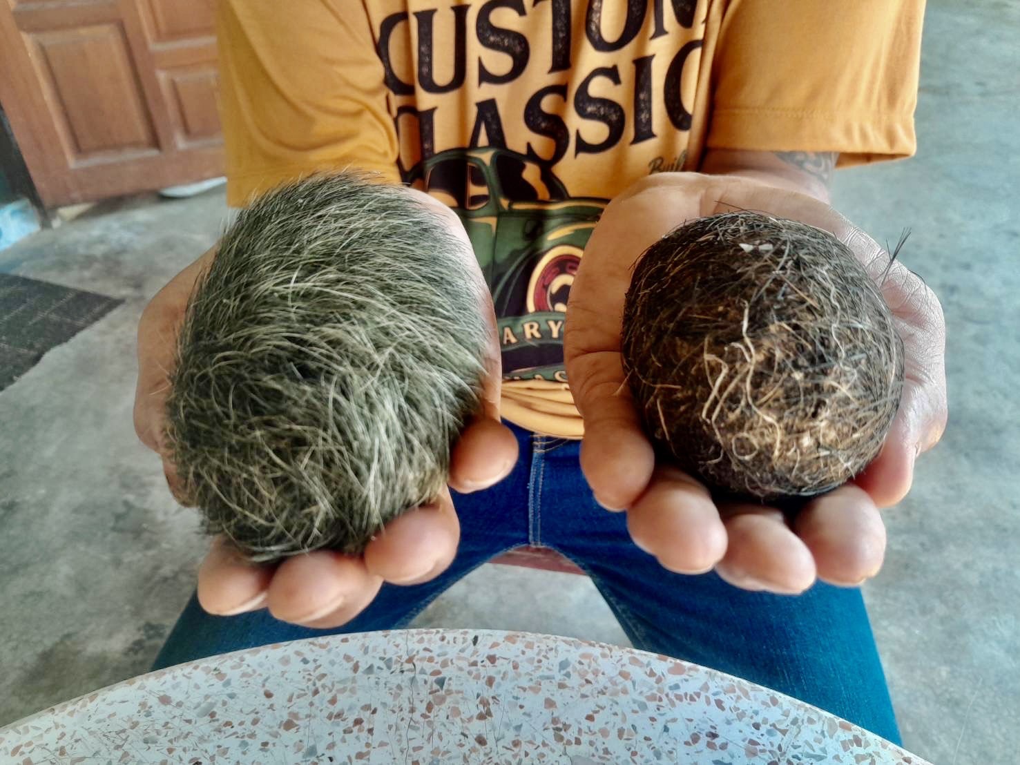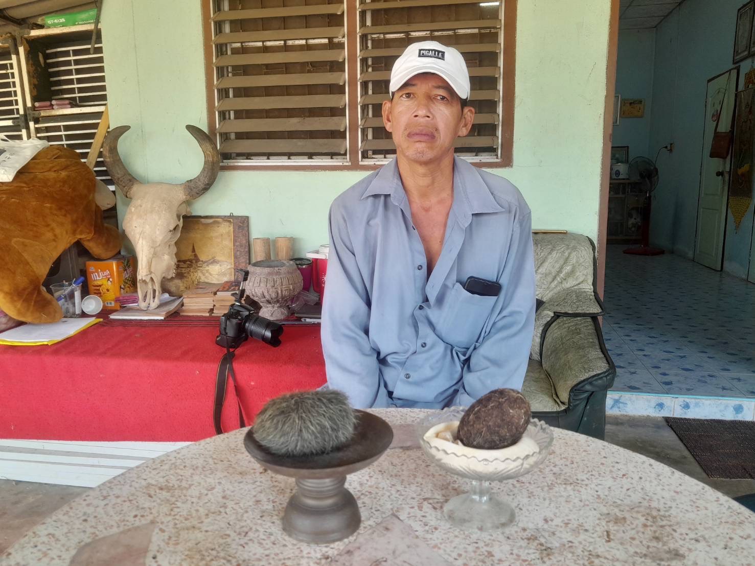 ต่อมาผู้สื่อข่าวได้เดินทางไปพบกับเจ้าของอวกหมูป่าทราบชื่อนายธนยศ (หนึ่ง)ฉิมพาลี อายุ 51 ปี 9/6 มา.4 ตรง.แหลมบัว อ.นครชัยศรี จ.นครปฐม ได้เล่าให้ฟังว่าที่บ้านมีอ้วกหมูป่าจะเป็นก้อนทรงวงลีออกสีดำซึ่งที่ได้มาช่วงแรกมีอาชีพชะแระหมูขายช่วงประมาณปี 2559 ตนเองไปชื้อหมูป่ามาจากบ้านหมู่ใหญ่บ้านแถวตำบลท่าตำหนัก อำเภอนครชัยศรีและนำมาชำแระเนื้อขาย เมื่อทำหมูป่าและจะล้างเครื่องในและพบก้อนอ้วกอยู่ในถุงน้ำดีซึ่งช่วงแรกจะไม่รู้ว่าคืออะไรแต่ก็มีคนงานที่มาช่วยทำหมูเป็นคนกัมพูชามาขอโดยบอกว่าอยากได้ ซึ่งตนเองก็ไม่ทราบว่าเป็นอะไร แต่พอเอามาตรวจสอบพบว่ามีใหญ่เท่าฝ่ามือหนักประมาณ 1 กิโลกรัม และไม่ได้ยกให้ใคร จากนั้นได้นำไปล้างน้ำมาใส่จานตั้งไว้ให้แห้งและเอามาเก็บบูชา