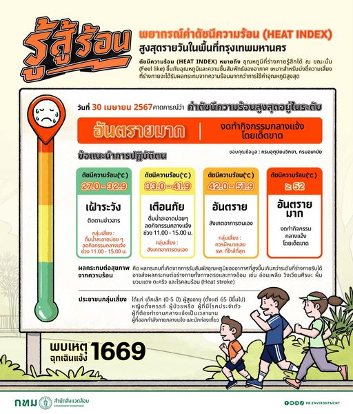 นอกจากนี้ ศูนย์ข้อมูลคุณภาพอากาศกรุงเทพมหานคร โดยทีมโฆษกศูนย์และทีมประชาสัมพันธ์ของสำนักสิ่งแวดล้อม ได้ประสานสำนักการแพทย์เชิญแพทย์ผู้เชี่ยวชาญมาให้ความรู้เรื่องภาวะฮีทสโตรก และแนะนำวิธีการดูแลสุขอย่างต่อเนื่อง หากพบผู้ป่วยสามารถแจ้งสายด่วน 1669 ทั้งนี้ ประชาชนสามารถติดตามการพยากรณ์อากาศจากเว็บไซต์ของกรมอุตุนิยมวิทยา http://www.tmd.go.th และอินโฟกราฟิกค่าดัชนีความร้อน (HEAT INDEX) ผ่านเพจเฟซบุ๊ก : สำนักสิ่งแวดล้อม กรุงเทพมหานคร