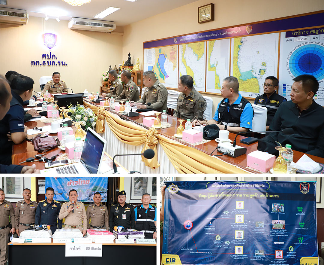 เมื่อเวลา 11.00 น.วันนี้ (7 พ.ค.67) ที่สถานีตำรวจน้ำ 2 กองกำกับการ 6 (สุราษฎร์ธานี) กองบังคับการตำรวจน้ำ อำเภอเมือง จังหวัดสุราษฎร์ธานี นายเจษฎา จิตรัตน์ ผู้ว่าราชการจังหวัดสุราษฎร์ธานี พร้อมด้วย พลตำรวจตรีเสริมพันธุ์ ศิริคง ผู้บังคับการตำรวจภูธรจังหวัดสุราษฎร์ธานี พันตำรวจเอกนิรัตน์ ช่วยจิตต์ ผู้กำกับการ 6 กองบังคับการตำรวจน้ำ ,นายรัชพล ปาละกูล นักวิเคราะห์นโยบายและแผนเชี่ยวชาญ สำนักงาน ป.ป.ส. ภาค8 , เจ้าหน้าที่ชุดสืบสวนตำรวจน้ำ ตำรวจชุดจำกับกุมและผู้เกี่ยวข้อง ร่วมกันแถลงผลจับกุมคดียาเสพติด ภายใต้ชื่อปฏิบัติการ “ยุทธการ เด็ดปีก อ่าวไทย” โดยสามารถจับกุมผู้ต้องหาได้ 4 คน ประกอบด้วย นายวิเชษฐ หรือเชษ เทศนอก อายุ 70 ปี และนายจรัส หรือรัส อะเส็ม อายุ 54 ปี ชาวจังหวัดตรัง,นายนิติกร หรือแหลม เสียมไหม อายุ 55 ปีชาวจังหวัดสตูล ,และนายสุรศักดิ์ หรือปอน มากนวล อายุ 32 ปี ชาวจังหวัดพัทลุง ซึ่งเป็นขบวนการค้ายาเสพติดรายใหญ่ในพื้นที่ พร้อม ของกลางไอซ์ 80 กิโลกรัม อาวุธปืน 1 กระบอก เครื่องกระสุนปืน 13 นัด และ รถกระบะ 2 คัน นอกจากนี้ ยังขยายผลจับกุม ผู้ต้องหาได้อีก 1 คน คือ นายนพพร หนูเกตุ อายุ 30 ปี ซึ่งเป็นผู้ติดต่ออยู่บนฝั่ง และเจ้าหน้าที่ ยังคงขยายผลและมีการออกหมายจับเพิ่มเติม เพื่อสาวไปถึงตัวการใหญ่ของขบวนการค้ายาเสพติดกลุ่มนี้