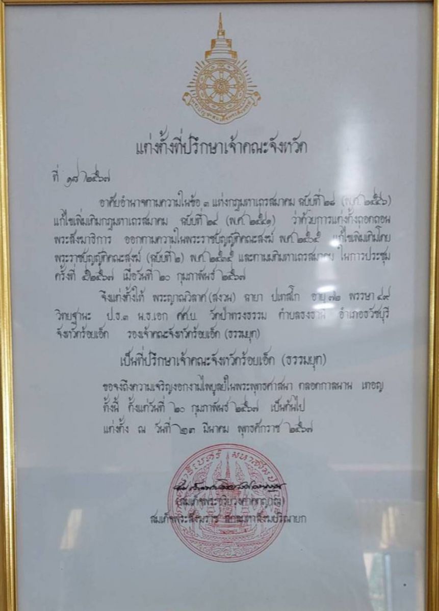 ร้อยเอ็ด-รอง.ผวจ.รอ. ร่วมพิธีรับมอบพระบัญชาสมเด็จพระสังฆราช แต่งตั้งพระญาณวิลาศ เป็นที่ปรึกษาเจ้าคณะจังหวัดร้อยเอ็ด (ธ)