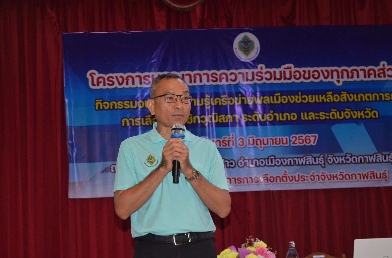 วันที่ 3 พฤษภาคม 2567 ที่ห้องประชุมทศพร โรงแรมริมปาว จ.กาฬสินธุ์ นายสนั่น พงษ์อักษร ผู้ว่าราชการ จ.กาฬสินธุ์ เป็นประธานเปิดกิจกรรมอบรมให้ความรู้เครือข่ายพลเมืองช่วยเหลือและสังเกตการณ์การเลือกสมาชิกวุฒิสภา ระดับอำเภอ และระดับจังหวัด ตามโครงการบูรณาการความร่วมมือของทุกภาคส่วน โดยมีนายผดุงศักดิ์ อิ่มเอิบ ปลัด จ.กาฬสินธุ์ ร้อยตำรวจเอก มนูญ วิเชียรนิตย์ ผอ.กกต.กาฬสินธุ์ พล.ต.ต.มนตรี จรัลพงศ์ กรรมการการเลือกตั้งสว.ระดับจังหวัด จ.กาฬสินธุ์ นายสำเนียง หวังเจริญ ท้องถิ่น จ.กาฬสินธุ์ นายสุรเดช เคราะห์ดี เจ้าหน้าที่ผู้ช่วยเหลือการปฏิบัติงานของผู้อำนวยการการเลือกระดับจังหวัด ผู้ตรวจการเลือกตั้ง คณะกรรมการศูนย์ส่งเสริมพัฒนาประชาธิปไตย (ศส.ปชต.) ผู้แทนสภาองค์กรชุมชน เครือข่ายเยาวชนสังเกตการณ์การเลือกตั้ง (We Watch)และดีเจประชาธิปไตย รวมจำนวน 142 คน