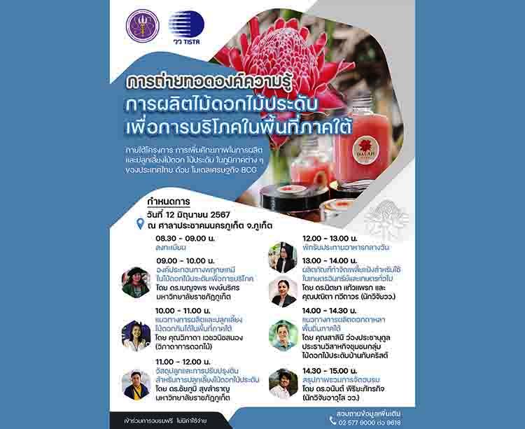 กรุงเทพฯ-กระทรวงการอุดมศึกษา วิทยาศาสตร์ วิจัยและนวัตกรรม (อว.) โดย สถาบันวิจัยวิทยาศาสตร์และเทคโนโลยีแห่งประเทศไทย (วว.)ดำเนินงาน โครงการการเพิ่มศักยภาพในการผลิตและปลูกเลี้ยงไม้ดอกไม้ประดับในภูมิภาคต่างๆ ของประเทศไทยด้วยโมเดลเศรษฐกิจ BCG ขอเชิญผู้สนใจเข้าร่วมการอบรมถ่ายทอดองค์ความรู้ฟรี! ในหัวข้อเรื่อง “การผลิตไม้ดอกไม้ประดับเพื่อการบริโภคในพื้นที่ภาคใต้” จัดโดย ศูนย์เชี่ยวชาญนวัตกรรมเกษตรสร้างสรรค์ วว. ในวันที่ 12 มิถุนายน2567เวลา 08.30 - 14.00 น.ณ ศาลาประชาคมนครภูเก็ต จังหวัดภูเก็ต