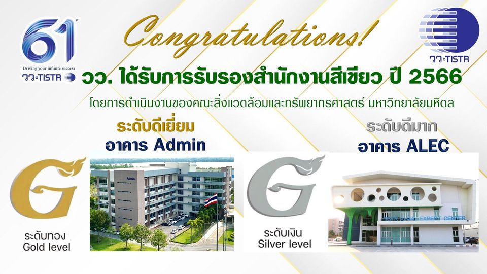 กรุงเทพฯ-กระทรวงการอุดมศึกษา วิทยาศาสตร์ วิจัยและนวัตกรรม (อว.) โดย สถาบันวิจัยวิทยาศาสตร์และเทคโนโลยีแห่งประเทศไทย (วว.) ได้รับการรับรองสำนักงานสีเขียว ประจำปี 2566 ในฐานะหน่วยงานที่สนับสนุนงบประมาณของตนเองโดยการดำเนินงานของคณะสิ่งแวดล้อมและทรัพยากรศาสตร์ มหาวิทยาลัยมหิดล จำนวน 2 รางวัลดังนี้
