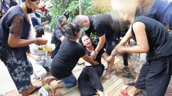 ขณะที่ญาติของผู้ต้องหา และนางกาญจนา ซุยเสนา อายุ 40 ปี แม่ของผู้ต้องหาร้องไห้เสียใจ เมื่อเห็นลูกชายต้องมากลายเป็นผู้ต้องหาฆ่าภรรยาของตัวเองตาย พร้อมกับบอกให้ลูกชายประพฤติตนให้ดี ขณะอยู่ในเรือนจำ และโผเข้าไปกอดกันร้องไห้เสียงดัง สร้างความสลดใจแก่ชาวบ้านและญาติพี่น้องที่มามุงดูเหตุการณ์ ก่อนที่ญาติของผู้ตายและผู้ต้องหาพากันขนของใช้ส่วนตัวไปที่ป่าช้า เพื่อประกอบพิธีฌาปนกิจศพผู้ตายในวันเดียวกัน