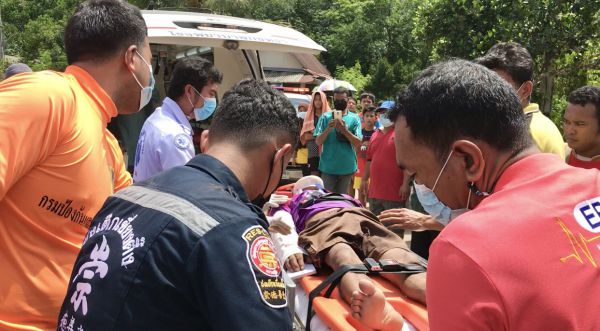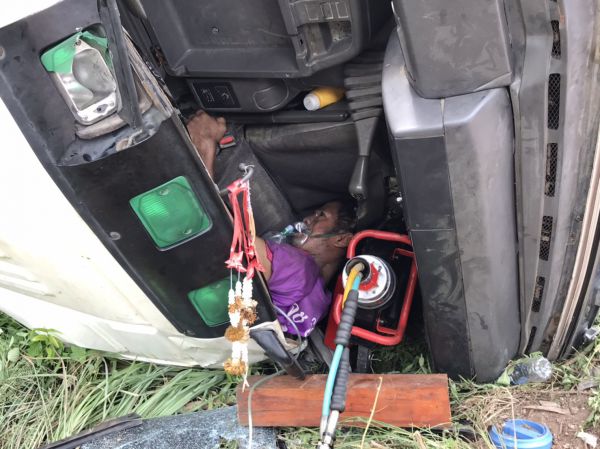 จึงประสานขอสนับสนุนรถเครนช่วยเหลือที่เกิดเหตุ ระหว่างที่รอรถเครนเจ้าหน้าที่ให้ออกซิเจนกับผู้บาดเจ็บ เพราะช่วงเกิดเหตุมีแดดร้อนจัด เกรงว่าผู้บาดเจ็บจะหมดสติ ท่ามกลางชาวบ้านที่มารอดูอยู่เป็นจำนวนมากและได้ช่วยกันกางร่มให้ผู้บาดเจ็บเมื่อรถเครนมาถึงก็ได้ใช้โซ่คล้องส่วนเพลาใต้หัวรถ และค่อยๆใช้เครนดึงขึ้น เจ้าหน้าที่ใช้เวลาช่วยเหลืออยู่ร่วม 2 ชม. ก็สามารถนำตัวผู้บาดเจ็บออกมาได้ ก่อนเร่งนำส่ง รพ.กงหราเพื่อรักษาต่อไป สำหรับสาเหตุอยู่ระหว่างรอสอบปากคำของผู้ได้รับบาดเจ็บ