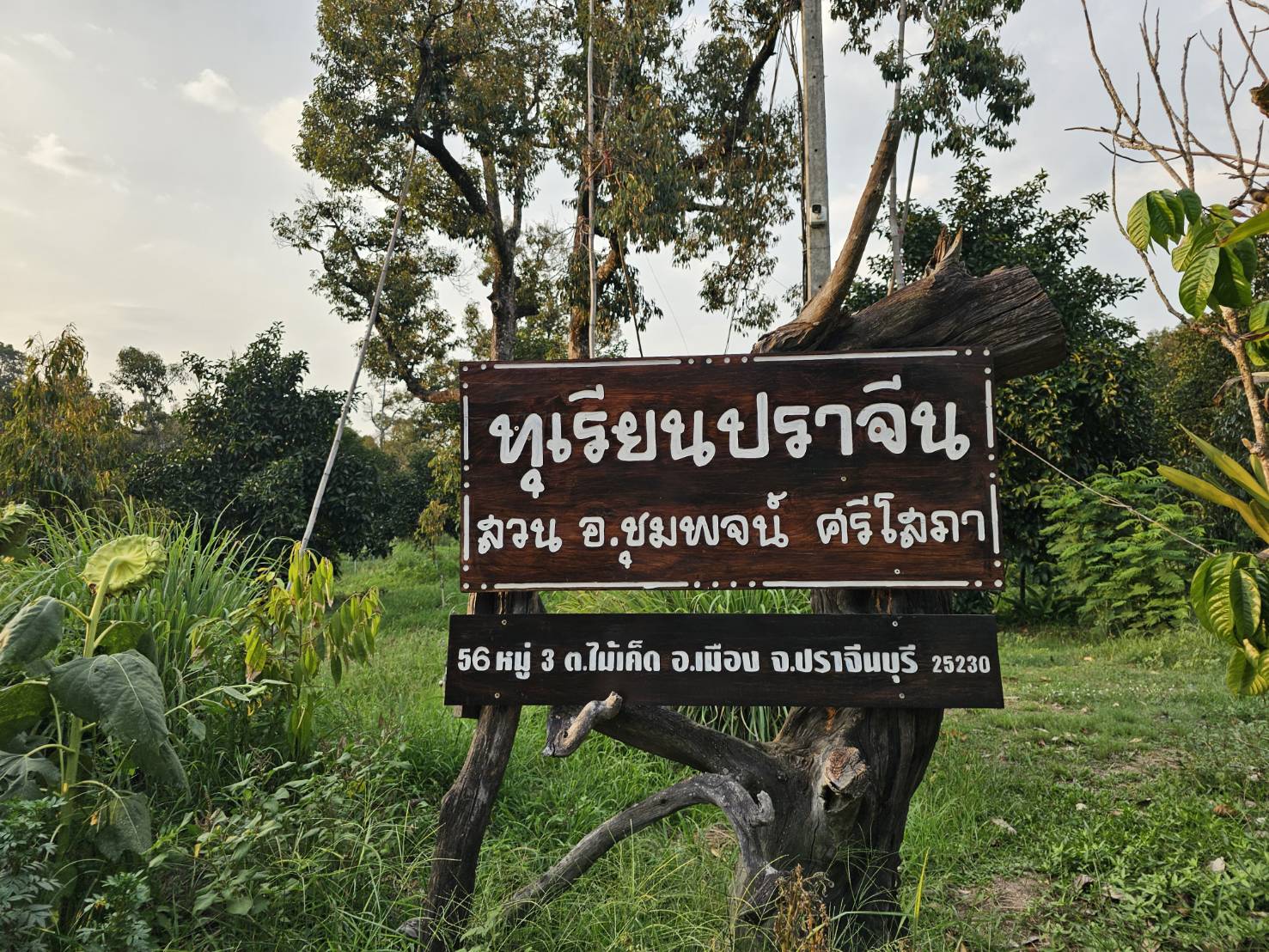 วันนี้ จึงพามาที่สวนทุเรียนเก่าแก่ อายุต้นพันธุ์ทุเรียนมากกว่า 65 ปี มีผสมผสานกับทุเรียนที่ปลูกแซมใหม่ บนเนื้อที่เกือบ100ไร่ ปลูกผลไม้ผสมผสาน แต่ผลไม้หลักคือพันธุ์ทุเรียนGI.ปราจีนบุรีหลากหลาย ที่ต้นพันธุ์เก่าแก่ยังคงอนุรักษ์ไว้ขนาดต้นใหญ่ 2 คนโอบ สูงร่วม 20 เมตรเศษ แต่ ยังคงให้ผลผลิต มาที่สวนของ อ.เมืองปราจีนบุรี อาจารย์จุมพจน์ ศรีโสภาอายุ75ปี อดีตครูฝ่ายปกครองโรงเรียนประจำจังหวัด(หญิง)ปราจีนกัลยาณี (ปกณ.)เลขที่ 56 หมู่ 3 ต.ไม้เค็ด จ.ปราจีนบุรี ปลูกทุเรียนหลากหลายทั้ง หมอนทอง,ก้านยาว,ชะนีและที่โดดเด่นกำลังฮอต! มาแรงสุด ที่ในบรรดานักชิมทุเรียนต้องลอง และขวนขวายชิม!ให้ได้ใน1 ปีคือทุเรียนสายพันธุ์ใหม่...“ทุเรียนสายพันธุ์ทับทิมทอง” ...