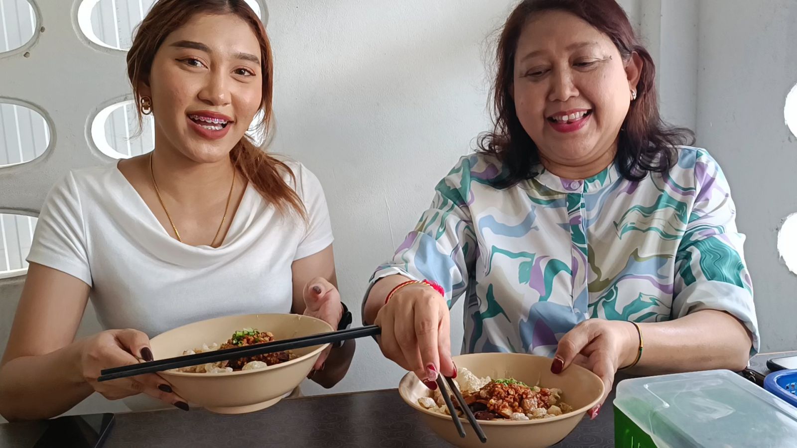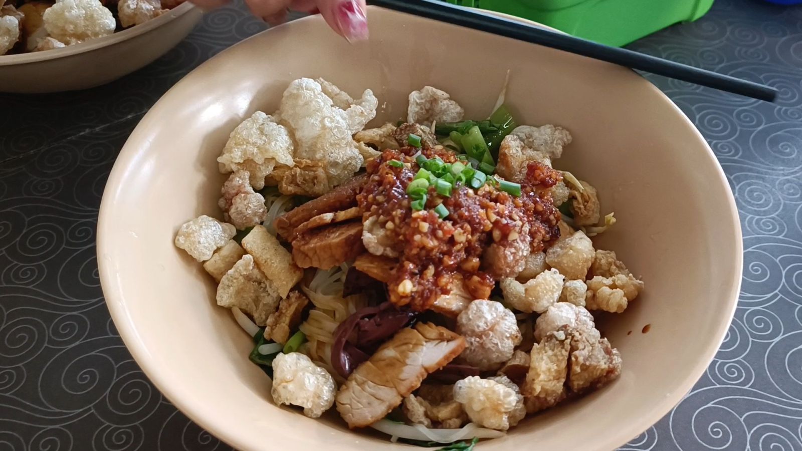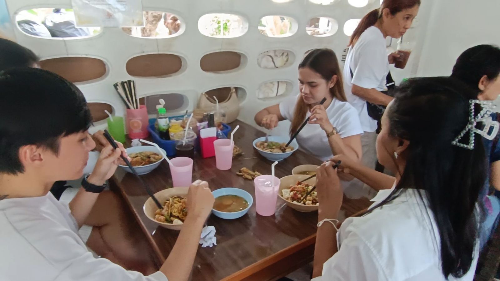 ขณะที่คนลวกเส้นสาวสวยลูกสาวของป้าพรเจ้าของร้านกำลังลวกเส้นพร้อมผักบุ้งและถั่วงอกตามเมนูอย่างจ้าละหวั่น เสร็จแล้วส่งต่อให้กับคนปรุงรส ที่ใส่เครื่องเคียงแน่นๆทั้งหมูแดง เลือดหมูเส้น น้ำซอสต่างๆตบท้ายด้วยกากหมูที่ใส่กันแบบแน่นๆอย่างไม่ยั้ง ก่อนจะนำไปเสิร์ฟให้ลูกค้า สำหรับเมนูยอดนิยมของร้านนี้ หมี่แห้ง หมี่น้ำ หมี่ต้มยำ หมี่เย็นตาโฟ ซึ่งทุกเมนูจะใส่กากหมูมาให้กันแบบจุกๆเพิ่มไขมันสร้างความอบอุ่นให้ร่างกาย ขณะที่ลูกค้าที่ได้กินต่างก็บอกว่าอร่อยสมคำร่ำลือจริงๆ และเมื่อกินเสร็จก็ต้องรีบลุกขึ้นเพราะเกรงใจคนที่มารออยู่ เหมือนกันการเล่นเก้าอี้ดนตรีเลยทีเดียว