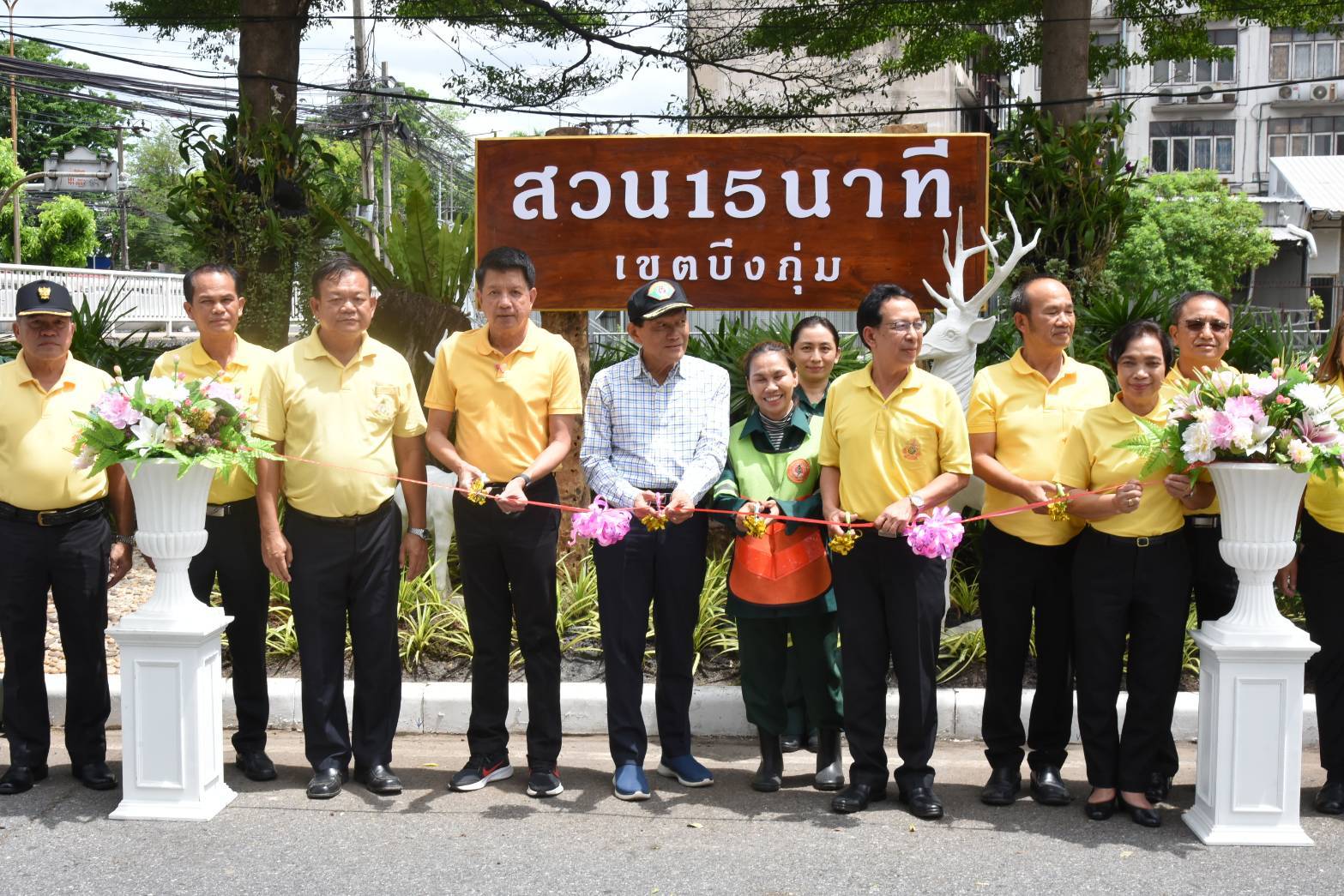 พัฒนาสวน 15 นาที บริเวณสวนริมคลองลำพังพวย ซอยนวมินทร์ 53 (หน้าร้านนิตยาไก่ย่าง) ในโอกาสนี้ รองผู้ว่าราชการกรุงเทพมหานคร เป็นประธานเปิดใช้งานสวนดังกล่าวอย่างเป็นทางการ พร้อมทั้งร่วมกับคณะผู้บริหารเขตบึงกุ่มปลูกต้นทองนพเก้า (ชะแมบทอง) บริเวณสวนริมคลองลำพังพวย เพื่อเพิ่มพื้นที่สีเขียว สร้างกำแพงกรองฝุ่นทั่วกรุง ตลอดจนเพิ่มความร่มรื่นและสวยงามให้กับสวนดังกล่าว จากนั้นสำรวจสวน 15 นาที บริเวณสวนริมคลองบางเตย (หลังวัดบางเตย) ซอยนวมินทร์ 58 เขตฯ มีสวน 15 นาที (สวนเดิม) ได้แก่ 1.ศูนย์การเรียนรู้การจัดการขยะมูลฝอย พื้นที่ 6 ไร่ 2.สวนหมู่บ้านเสริมมิตร พื้นที่ 79 ตารางวา 3.อุทยานบึงบัว พื้นที่ 11 ไร่ 1 งาน 8 ตารางวา สวน 15 นาที (สวนใหม่) ได้แก่ 1.สวนโรงเรียนวัดนวลจันทร์ พื้นที่ 450 ตารางเมตร 2.สวนหมู่บ้านทวีสุข-นาริสา ด้านหน้าทางเข้าสวนป่าชุ่มน้ำบางกอก พื้นที่ 216 ตารางเมตร 3.สวนริมคลองลำพังพวย ซอยนวมินทร์ 53 (หน้าร้านนิตยาไก่ย่าง) พื้นที่ 550 ตารางเมตร 4.สวนริมคลองบางเตย (หลังวัดบางเตย) ซอยนวมินทร์ 58 พื้นที่ 190 ตารางเมตร อยู่ระหว่างปรับสภาพพื้นที่ 5.สวนริมบึงพังพวย พื้นที่ 666 ตารางเมตร อยู่ระหว่างดำเนินการ และสวน 15 นาที (อยู่ระหว่างการสำรวจพื้นที่) ได้แก่ 1.สวนหน้าโรงเรียนสุขุมนวพันธ์อุปถัมภ์ พื้นที่ 314 ตารางเมตร 2.สวนโรงเรียนแย่มจาดวิชชานุสรณ์ พื้นที่ 157 ตารางเมตร 3.สวนโรงเรียนคลองลำเจียก พื้นที่ 380 ตารางเมตร 4.สวนโรงเรียนคลองกุ่ม พื้นที่ 210 ตารางเมตร 5.สวนนวมินทร์ 65 พื้นที่ 800 ตารางเมตร 6.สวนนวมินทร์ 58 (ฝั่งคอนโด) พื้นที่ 258 ตารางเมตร ทั้งนี้ รองผู้ว่าราชการกรุงเทพมหานคร ได้มอบหมายให้เขตฯ พิจารณาถึงความเหมาะสมในการใช้พื้นที่เพื่อจัดทำสวน 15 นาที การออกแบบพื้นที่ใช้สอยภายในสวนให้ตรงตามความต้องการของชุมชนในพื้นที่และประชาชนที่เข้ามาใช้บริการ เพื่อให้การจัดทำสวน 15 นาที เกิดประสิทธิภาพและเป็นไปตามวัตถุประสงค์อย่างแท้จริง