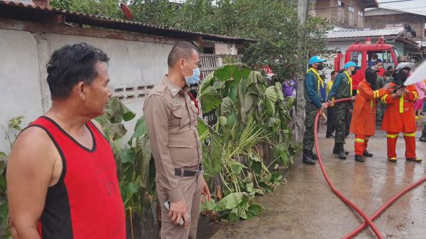 ในที่เกิดเหตุ ฝนพึ่งหยุดตก พบว่าเพลิงกำลังลุกไหม้บ้าน 2 ชั้น ครึ่งไม้ครึ่งปูน เสียหายทั้งหลัง เจ้าหน้าที่ช่วยกันฉีดน้ำดับเพลิง ไม่ให้ลุกลามไปบ้านข้างเคียง แต่เนื่องจากมีลมกระโชกเป็นระยะ ทำให้เพลิงลุกลามไปบ้านข้างเคียงอีกหลัง เลขที่ 147 เป็นบ้าน 2 ชั้นครึ่งไม้ครึ่งปูน แต่ก็เสียหายทั้งหลัง เจ้าหน้าที่ดับเพลิงใช้เวลาประมาณ 30 นาที จึงควบคุมเพลิงไว้ได้ พบบ้านเรือนเสียหาย 2 หลัง