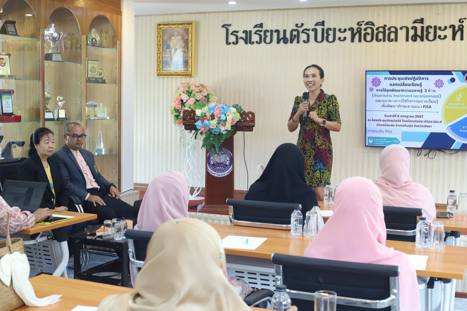 พังงา-วันเสาร์ที่ 6 กรกฎาคม 2567 สำนักงานศึกษาธิการจังหวัดพังงา จัดการประชุมแลกเปลี่ยนเรียนรู้การใช้ชุดพัฒนาความฉลาดรู้ 3 ด้าน (ด้านการอ่าน วิทยาศาสตร์ และคณิตศาสตร์) และแนวทางการใช้กิจกรรมเรียนรู้ในการพัฒนาทักษะตามแนว PISA เพื่อพัฒนาศักยภาพครูในการจัดการเรียนรู้ ส่งเสริมสมรรถนะผู้เรียนในด้านความฉลาดรู้การอ่าน ด้านคณิตศาสตร์และด้านวิทยาศาสตร์ และเพื่อเตรียมความพร้อมในการขับเคลื่อนการยกระดับผลการประเมินสมรรถนะนักเรียนตามมาตรฐานสากล (PISA) ระดับสถานศึกษา โดยศึกษานิเทศก์ชำนาญการพิเศษ นางสาวปัญจณี อุ้ยเฉ้ง พร้อมด้วยครูแกนนำภาษาไทย นางธิดา หัศนี รองผู้อำนวยการโรงเรียนตัรบียะห์อิสลามียะห์ นางสาวเจ๊ะรออานา เปาะมะ ครูแกนนำด้านคณิตศาสตร์ และนางสาววินันญา งะสมัน ครูแกนนำด้านวิทยาศาสตร์ ร่วมเป็นวิทยากรให้คำแนะนำในการใช้เครื่องมือประเมินสมรรถนะนักเรียน ทั้ง 3 ด้าน แก่ผู้เข้ารับการอบรมซึ่งประกอบด้วยครูผู้สอนในรายวิชาภาษาไทย คณิตศาสตร์ วิทยาศาสตร์ระดับชั้นมัธยมศึกษาปีที่ 2-3 ในโรงเรียนดาริสลามวิทยา โรงเรียนศรัทธาธรรม โรงเรียนสังคมอิสลามวิทยาและโรงเรียนตัรบียะห์อิสลามียะห์ ซึ่งนางสาวจันทนา สวัสดิ์ ผู้อำนวยการกลุ่มส่งเสริมการศึกษาเอกชน ร่วมพบปะให้กำลังใจแก่ผู้เข้าประชุม ณ ห้องประชุมอัลคุบัยซีย์ โรงเรียนตัรบียะห์อิสลามียะห์