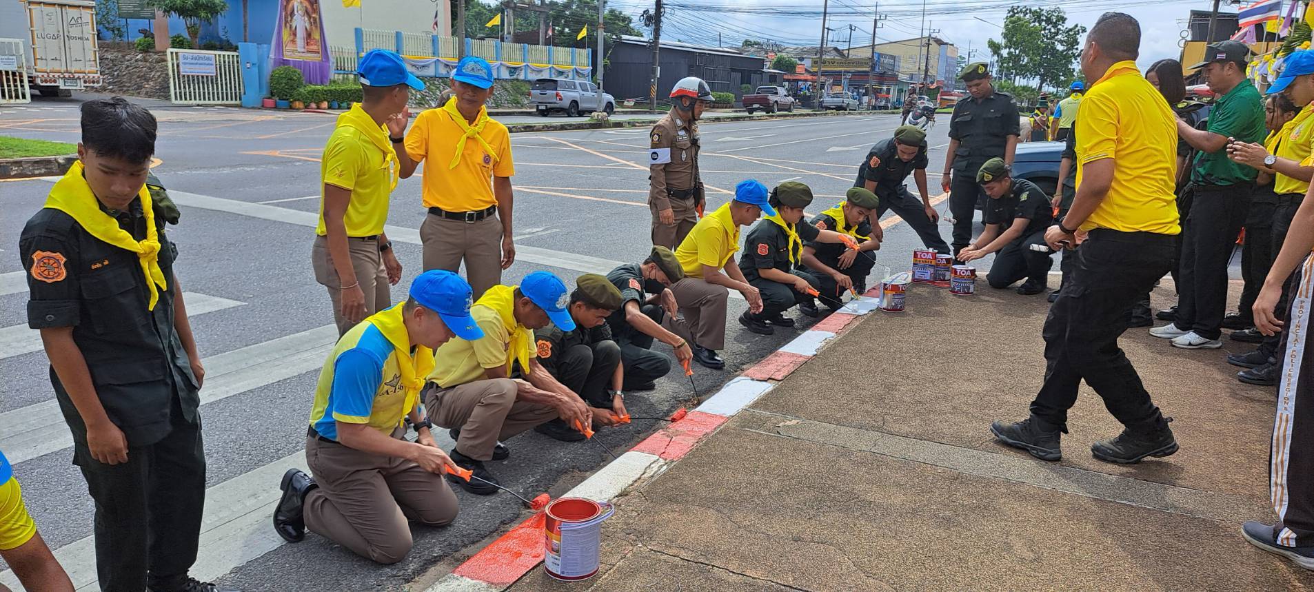ตร.กระบี่-เทศบาลเมืองกระบี่จัดจิตรอาสา ทาสี-ตีเส้นบนผิวจราจรลดอุบัติเหตุ