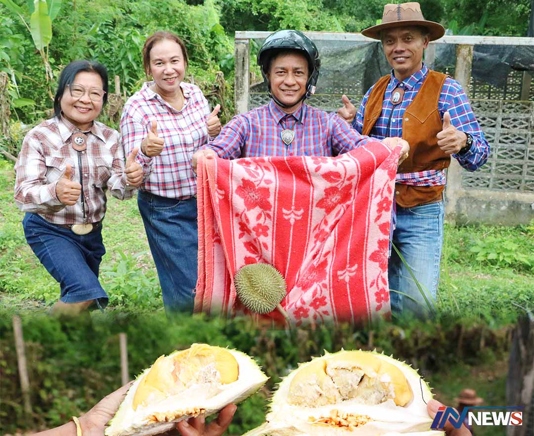พังงา-อย่างฮา คาวบอยสวมหมวกกันน็อกและใช้ผ้าห่มเก็บทุเรียนสาลิกา พร้อมอนุรักษ์พันธุ์จากต้นแม่ในวิทยาลัยเกษตรฯ