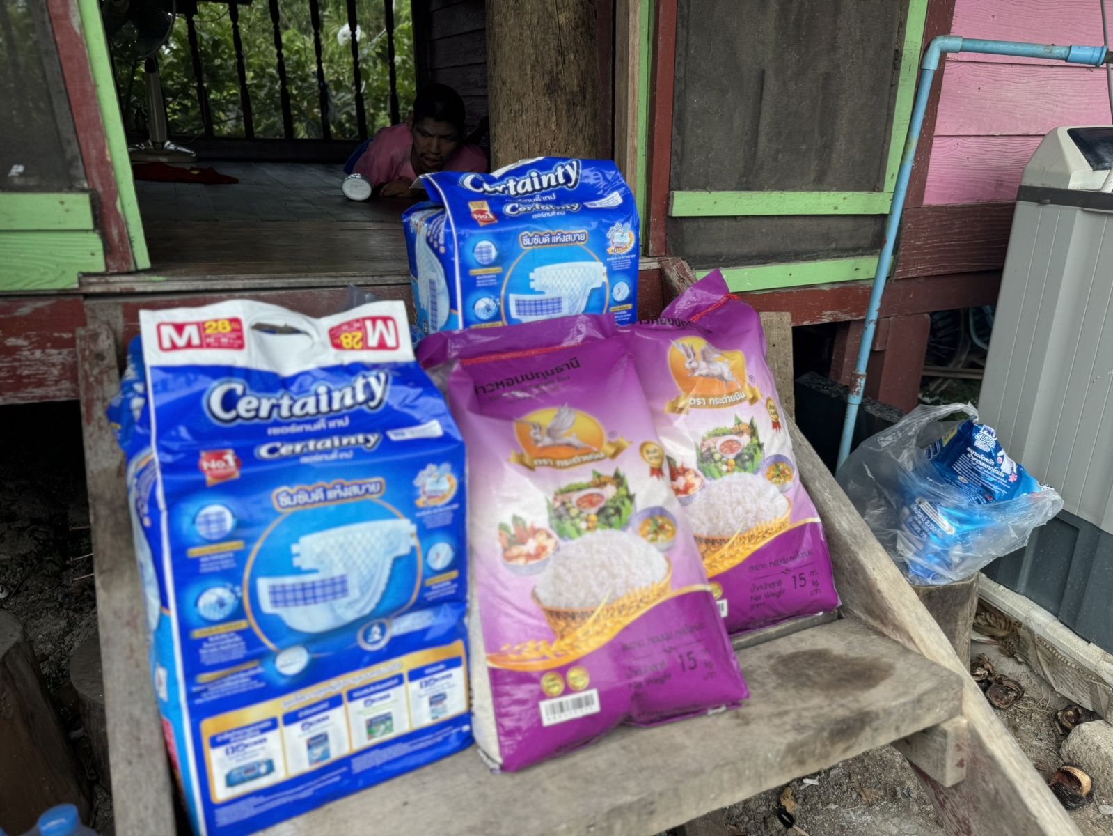 โดยพระครูศรีสุตากร ได้นำข้าวสาร 30 กิโลกรัม ไข่ไก่ 5 แผง น้ำดื่ม 20 แพ็ค แพมเพิสไซร้ m 4 ถุง และเงินอีก 3,000 บาท พร้อมกับให้กำลังใจสอบถามชีวิตความเป็นอยู่ในแต่ละวันและภารกิจที่ผู้เป็นแม่และภรรยาเจ้าของบ้านต้องทำในแต่ละวัน