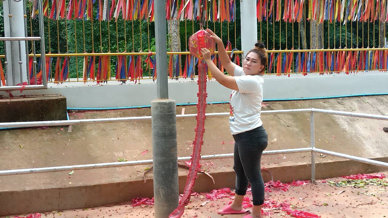 ขณะเดียวกันมีผู้หญิงอีกรายหนึ่งมาแก้บน โดยเจ้าตัวขอไม่บอกชื่อนามสกุลจริง โดยเจ้าตัวบอกว่า อายคนตนเองได้เลขจากท้าวเวสสุวรรณมาไม่ต่ำกว่า 4 ครั้ง ซึ่งในแต่ละครั้งได้ลาภก้อนใหญ่ ในวันนี้มาแก้บนและขอโชคลาภในงวดที่จะถึงนี้ ซึ่งได้จุดประทัดแก้บนชุดเล็ก