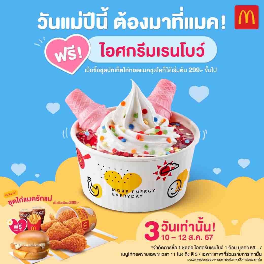 กรุงเทพฯ ( 9 สิงหาคม 2567) – แมคโดนัลด์ จัดโปรฯ ชวนบอกรักแม่ ให้อิ่มอร่อยสุดคุ้ม รับไอศกรีมเรนโบว์ ฟรี! เมื่อลูกค้าซื้อชุดบักเก็ตไก่ทอดแมคชุดใดก็ได้ ราคาเริ่มต้น 299 บาทขึ้นไป (จำกัดการซื้อ 1 ชุด ต่อ 1 สิทธิ) เฉพาะวันที่ 10-12 สิงหาคม 2567 นี้ ที่ร้านแมคโดนัลด์ทุกสาขาที่ร่วมรายการ, แมคไดร์ฟ ทรู และซื้อกลับบ้าน สามารถดูรายละเอียดเพิ่มเติมได้ที่ Facebook.com/McThai