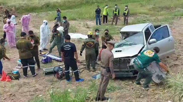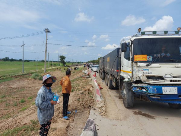 ที่เกิดเหตุเป็นถนนที่กำลังก่อสร้างขยายจากสองเลนเป็นสี่เลน บริเวณข้างทางพบรถยนต์กระบะยี่ห้อโตโยต้า วีโก้ แบบแคป สีบอร์นเงินหมายเลขทะเบียน ตท 9346 กรุงเทพ ตกลงไปสภาพรถพังยับเยิน ภายในรถพบผู้เสียชีวิสองราย ทราบชื่อ นายสมศักดิ์ ไกรทอง อายุ 53 ปี บ้านเลขที่ตามบัตรประชาชนเลขที่ 789/21 ซอยฉลองกรุง 33 แขวงลำประทิว เขตลาดกระบัง กรุงเทพ ซึ่งเป็นคนขับ และ นางเสาร์ สงวนสุข อายุ 75 ปี นั่งข้างคนขับด้านซ้ายเสียชีวิตในที่เกิดเหตุ ส่วน นางวินญูรัตน์ สงวนสุข นั่งด้านหลังในส่วนแคปของรถได้รับบาดเจ็บเล็กน้อย ห่างออกไปบนถนนพบรถบรรทุกพ่วงยี่ห้อฮีโน่ สีขาว หมายเลขทะเบียนตัวรถ 83–6624 นครสวรรค์ หมายเลขทะเบียนตัวพ่วง 83–6625 นครสวรรค์ จอดอยู่สภาพรถด้านหน้ามุมขวาได้รับความเสียหาย โดยมี นายชัยณรงค์ ฤทธิ์บำรุง อายุ 50 ปี บ้านเลขที่ตามบัตรประชาชน 21/3 หมู่ที่ 5 ต.ดอนคา อ.ท่าตะโก จ.นครสวรรค์ คนขับรถพ่วงยืนรอพบเจ้าหน้าที่ตำรวจอยู่