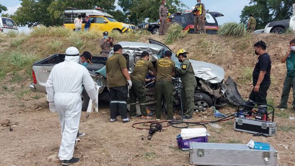 สิงห์บุรี-รถพ่วงหักหลบรถบรรทุก ประสานงากับรถกระบะที่สวนมาอย่างจัง ดับสลด 2 ราย บาดเจ็บ 1 ราย