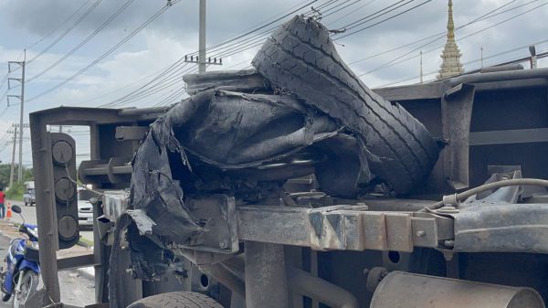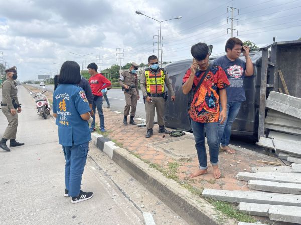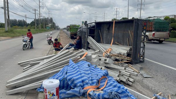 รถขนเสาปูนยางแตกพลิกคว่ำบาดเจ็บ1