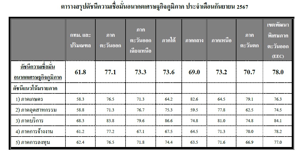 ดัชนีเชื่อมั่นอนาคตศก.ภูมิภาคในก.ย.67 สะท้าน6เดือนข้างหน้ายังขยายตัวได้ดี
